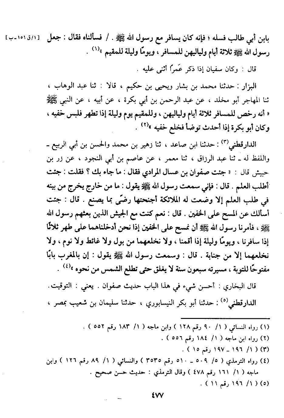 بِابْن أبي طَالب فسله؛ فَإِنَّهُ كَانَ يُسَافر مَعَ رَسُول الله - صَلَّى اللَّهُ عَلَيْهِ وَسَلَّم َ -. / فَسَأَلْنَاهُ فَقَالَ: جعل رَسُول الله - صَلَّى اللَّهُ عَلَيْهِ وَسَلَّم َ - ثَلَاثَة أَيَّام ولياليهن للْمُسَافِر، وَيَوْما وَلَيْلَة للمقيم ".