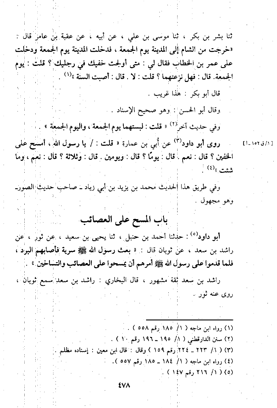 أَبُو دَاوُد: حَدثنَا أَحْمد بن حَنْبَل، ثَنَا يحيى بن سعيد، عَن ثَوْر، عَن رَاشد بن سعد، عَن ثَوْبَان قَالَ: " بعث رَسُول الله - صَلَّى اللَّهُ عَلَيْهِ وَسَلَّم َ - سَرِيَّة فَأَصَابَهُمْ الْبرد، فَلَمَّا قدمُوا على رَسُول الله - صَلَّى اللَّهُ عَلَيْهِ وَسَلَّم َ - أَمرهم أَن يمسحوا على العصائب والتساخين ".