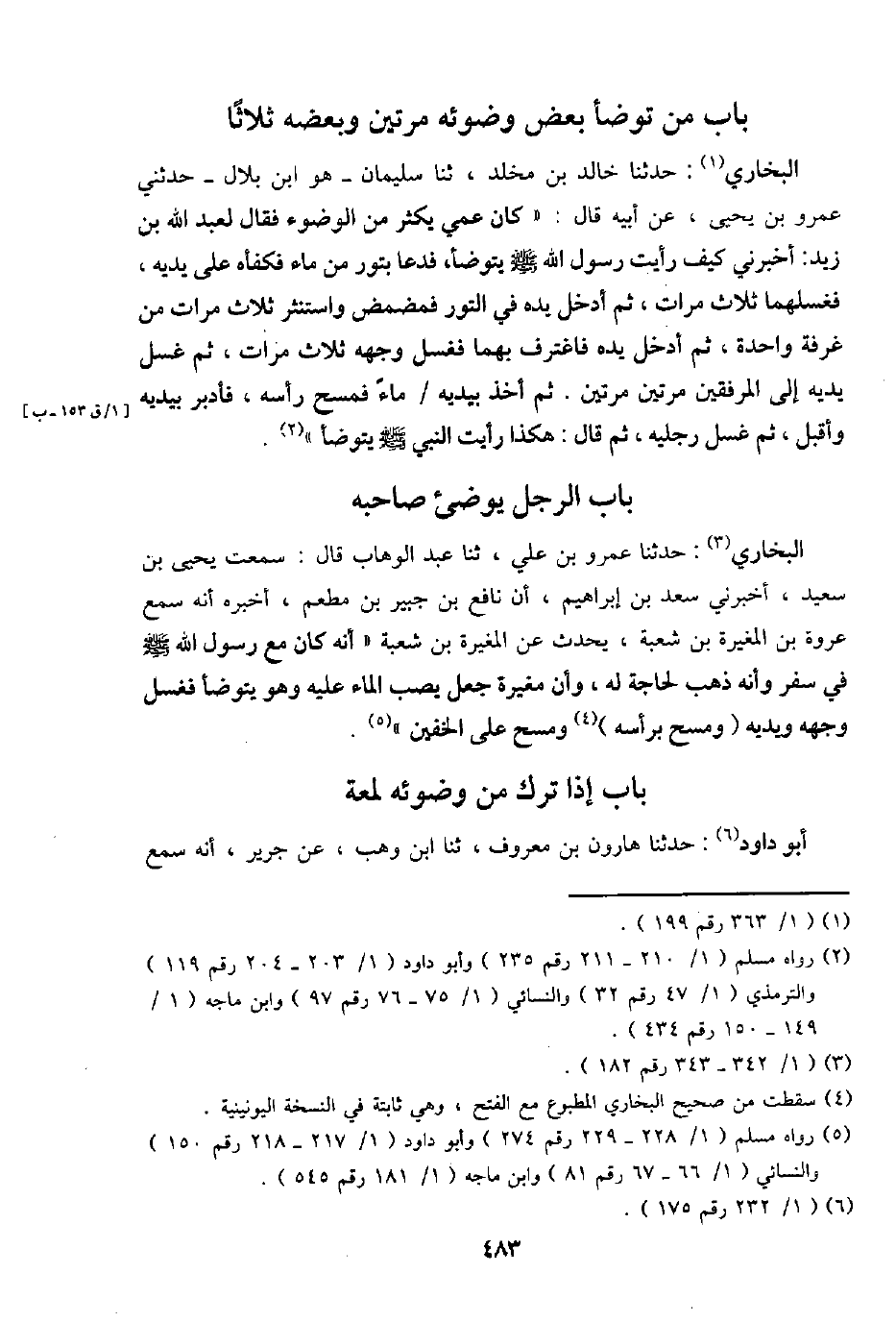البُخَارِيّ: حَدثنَا خَالِد بن مخلد، ثَنَا سُلَيْمَان - وَهُوَ ابْن بِلَال - حَدثنِي عَمْرو بن يحيى، عَن أَبِيه قَالَ: " كَانَ عمي يكثر من الْوضُوء فَقَالَ لعبد الله بن زيد: أَخْبرنِي كَيفَ رَأَيْت رَسُول الله - صَلَّى اللَّهُ عَلَيْهِ وَسَلَّم َ - يتَوَضَّأ، فَدَعَا بتور من مَاء فكفأه على يَدَيْهِ، فغسلهما ثَلَاث مَرَّات، ثمَّ أَدخل يَده فِي التور فَمَضْمض واستنثر ثَلَاث مَرَّات من غرفَة وَاحِدَة، ثمَّ أَدخل يَده فاغترف بهما فَغسل وَجهه ثَلَاث مَرَّات، ثمَّ غسل يَدَيْهِ إِلَى الْمرْفقين مرَّتَيْنِ مرَّتَيْنِ. ثمَّ أَخذ بيدَيْهِ / مَاء فَمسح رَأسه، فَأَدْبَرَ بيدَيْهِ وَأَقْبل، ثمَّ غسل رجلَيْهِ، ثمَّ قَالَ: هَكَذَا رَأَيْت النَّبِي - صَلَّى اللَّهُ عَلَيْهِ وَسَلَّم َ - يتَوَضَّأ ".