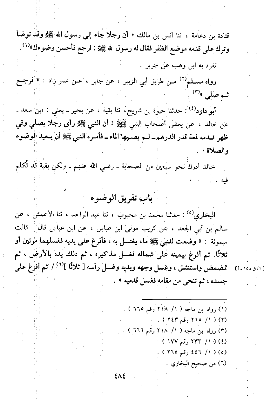 أَبُو دَاوُد: حَدثنَا حَيْوَة بن شُرَيْح، ثَنَا بَقِيَّة، عَن بحير - يَعْنِي: ابْن سعد - عَن خَالِد، عَن بعض أَصْحَاب النَّبِي - صَلَّى اللَّهُ عَلَيْهِ وَسَلَّم َ - " أَن النَّبِي - صَلَّى اللَّهُ عَلَيْهِ وَسَلَّم َ - رأى رجلا يُصَلِّي وَفِي ظهر قدمه لمْعَة قدر الدِّرْهَم - لم يصبهَا المَاء - فَأمره النَّبِي - صَلَّى اللَّهُ عَلَيْهِ وَسَلَّم َ - أَن يُعِيد الْوضُوء وَالصَّلَاة ".