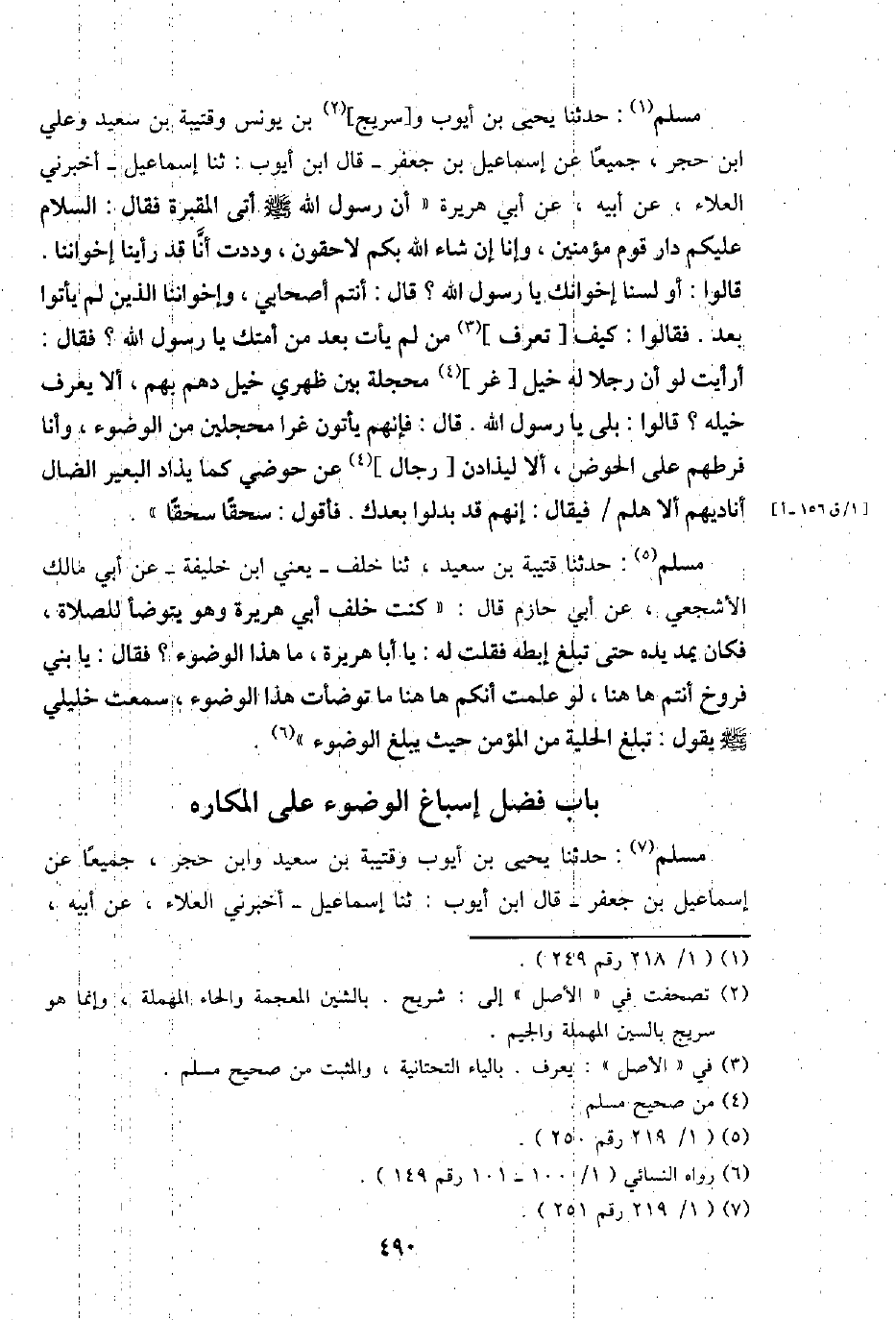 مُسلم: حَدثنَا يحيى بن أَيُّوب و [سُرَيج] بن يُونُس وقتيبة بن سعيد وَعلي ابْن حجر، جَمِيعًا عَن إِسْمَاعِيل بن جَعْفَر - قَالَ ابْن أَيُّوب: ثَنَا إِسْمَاعِيل - أَخْبرنِي الْعَلَاء، عَن أَبِيه، عَن أبي هُرَيْرَة " أَن رَسُول الله - صَلَّى اللَّهُ عَلَيْهِ وَسَلَّم َ - أَتَى الْمقْبرَة فَقَالَ: السَّلَام عَلَيْكُم دَار قوم مُؤمنين، وَإِنَّا إِن شَاءَ الله بكم لاحقون، وددت أَنا قد رَأينَا إِخْوَاننَا. قَالُوا: أَو لسنا إخوانك يَا رَسُول الله؟ قَالَ: أَنْتُم أَصْحَابِي، وإخواننا الَّذين لم يَأْتُوا بعد. فَقَالُوا: كَيفَ [تعرف] من لم يَأْتِ بعد من أمتك يَا رَسُول الله؟ فَقَالَ: أَرَأَيْت لَو أَن رجلا لَهُ خيل [غر] محجلة بَين ظَهْري خيل دهم بهم، أَلا يعرف خيله؟ قَالُوا: بلَى يَا رَسُول الله. قَالَ: فَإِنَّهُم يأْتونَ غرا محجلين من الْوضُوء، وَأَنا فرطهم على الْحَوْض، أَلا ليذادن [رجال] عَن حَوْضِي كَمَا يذاد الْبَعِير الضال أناديهم أَلا هَلُمَّ / فَيُقَال: إِنَّهُم قد بدلُوا بعْدك. فَأَقُول: سحقا سحقا ".