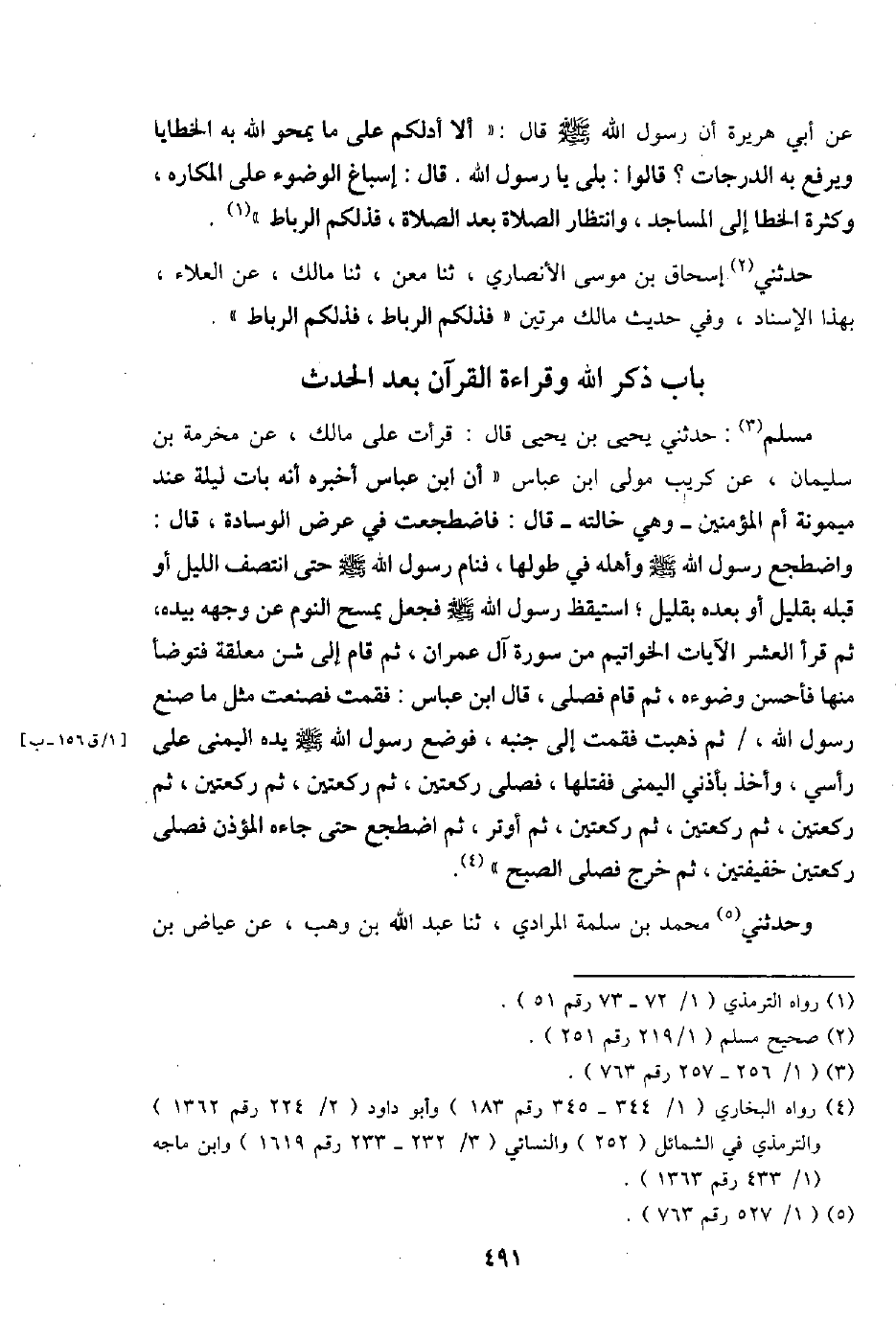 مُسلم: حَدثنِي يحيى بن يحيى قَالَ: قَرَأت على مَالك، عَن مخرمَة بن سُلَيْمَان، عَن كريب مولى ابْن عَبَّاس " أَن ابْن عَبَّاس أخبرهُ أَنه بَات لَيْلَة عِنْد مَيْمُونَة أم الْمُؤمنِينَ - وَهِي خَالَته - قَالَ: فاضطجعت فِي عرض الوسادة، قَالَ: واضطجع رَسُول الله - صَلَّى اللَّهُ عَلَيْهِ وَسَلَّم َ - وَأَهله فِي طولهَا، فَنَامَ رَسُول الله - صَلَّى اللَّهُ عَلَيْهِ وَسَلَّم َ - حَتَّى انتصف اللَّيْل أَو قبله بِقَلِيل أَو بعده بِقَلِيل؛ اسْتَيْقَظَ رَسُول الله - صَلَّى اللَّهُ عَلَيْهِ وَسَلَّم َ - فَجعل يمسح النّوم عَن وَجهه بِيَدِهِ، ثمَّ قَرَأَ الْعشْر الْآيَات الخواتيم من سُورَة آل عمرَان، ثمَّ قَامَ إِلَى شن معلقَة فَتَوَضَّأ مِنْهَا فَأحْسن وضوءه، ثمَّ قَامَ فصلى، قَالَ ابْن عَبَّاس: فَقُمْت فصنعت مثل مَا صنع رَسُول الله، / ثمَّ ذهبت فَقُمْت إِلَى جنبه، فَوضع رَسُول الله - صَلَّى اللَّهُ عَلَيْهِ وَسَلَّم َ - يَده الْيُمْنَى على رَأْسِي، وَأخذ بأذني الْيُمْنَى ففتلها، فصلى رَكْعَتَيْنِ، ثمَّ رَكْعَتَيْنِ، ثمَّ رَكْعَتَيْنِ، ثمَّ رَكْعَتَيْنِ، ثمَّ رَكْعَتَيْنِ، ثمَّ رَكْعَتَيْنِ، ثمَّ أوتر، ثمَّ اضْطجع حَتَّى جَاءَهُ الْمُؤَذّن فصلى رَكْعَتَيْنِ خفيفتين، ثمَّ خرج فصلى الصُّبْح ".