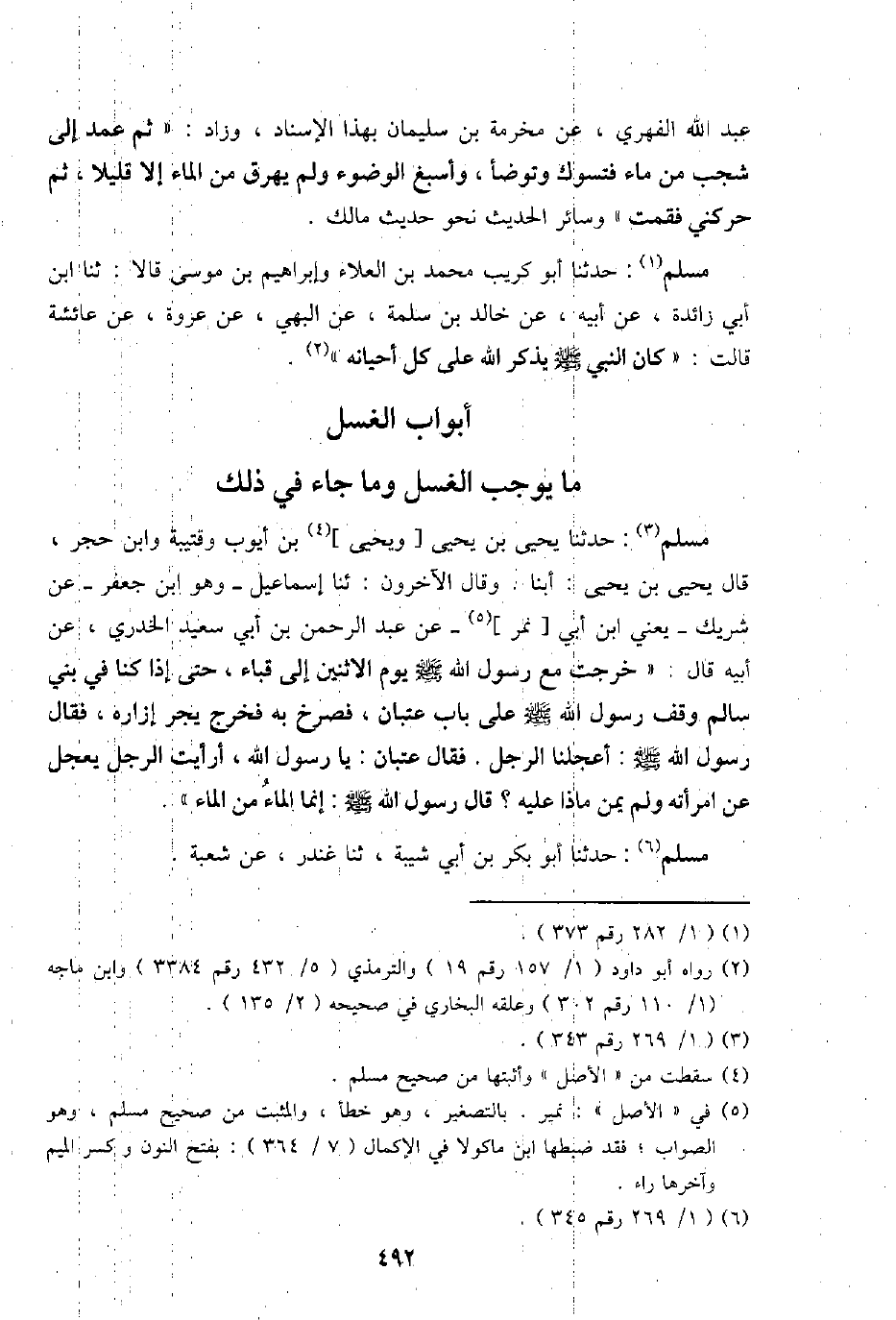 مُسلم: حَدثنَا يحيى بن يحيى [وَيحيى] بن أَيُّوب وقتيبة وَابْن حجر، قَالَ يحيى بن يحيى: أبنا. وَقَالَ الْآخرُونَ: ثَنَا إِسْمَاعِيل - وَهُوَ ابْن جَعْفَر - عَن شريك - يَعْنِي ابْن أبي [نمر]- عَن عبد الرَّحْمَن بن أبي سعيد الْخُدْرِيّ، عَن أَبِيه قَالَ: " خرجت مَعَ رَسُول الله - صَلَّى اللَّهُ عَلَيْهِ وَسَلَّم َ - يَوْم الِاثْنَيْنِ إِلَى قبَاء، حَتَّى إِذا كُنَّا فِي بني سَالم وقف رَسُول الله - صَلَّى اللَّهُ عَلَيْهِ وَسَلَّم َ - على بَاب عتْبَان، فَصَرَخَ بِهِ فَخرج يجر إزَاره، فَقَالَ رَسُول الله - صَلَّى اللَّهُ عَلَيْهِ وَسَلَّم َ -: أعجلنا الرجل. فَقَالَ عتْبَان: يَا رَسُول الله، أَرَأَيْت الرجل يعجل عَن امْرَأَته وَلم يمن مَاذَا عَلَيْهِ؟ قَالَ رَسُول الله - صَلَّى اللَّهُ عَلَيْهِ وَسَلَّم َ -: إِنَّمَا المَاء من المَاء ".
