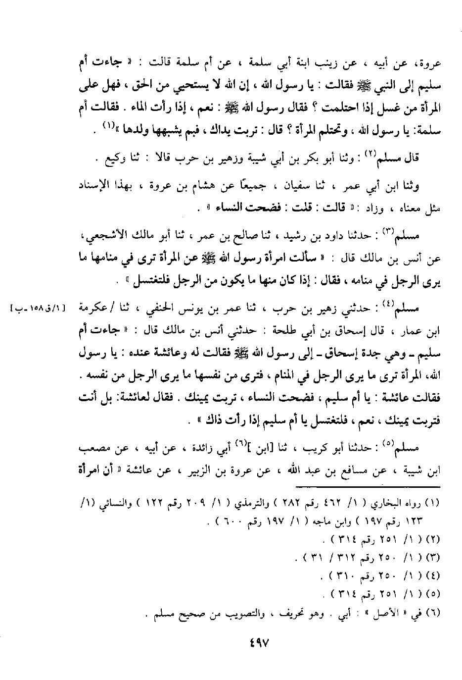 مُسلم: حَدثنِي زُهَيْر بن حَرْب، ثَنَا عمر بن يُونُس الْحَنَفِيّ، ثَنَا / عِكْرِمَة ابْن عمار، قَالَ إِسْحَاق بن أبي طَلْحَة: حَدثنِي أنس بن مَالك قَالَ: " جَاءَت أم سليم - وَهِي جدة إِسْحَاق - إِلَى رَسُول الله - صَلَّى اللَّهُ عَلَيْهِ وَسَلَّم َ - فَقَالَت لَهُ وَعَائِشَة عِنْده: يَا رَسُول الله، الْمَرْأَة ترى مَا يرى الرجل فِي الْمَنَام، فترى من نَفسهَا مَا يرى الرجل من نَفسه. فَقَالَت عَائِشَة: يَا أم سليم، فضحت النِّسَاء، تربت يَمِينك. فَقَالَ لعَائِشَة: بل أَنْت فتربت يَمِينك، نعم، فلتغتسل يَا أم سليم إِذا رَأَتْ ذَاك ".