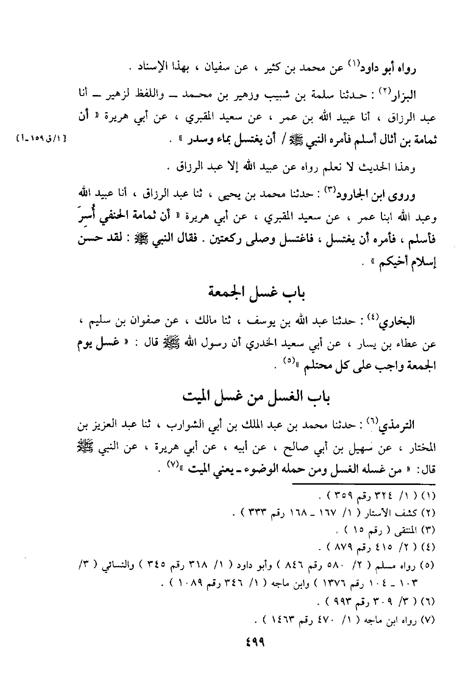وروى ابْن الْجَارُود: حَدثنَا مُحَمَّد بن يحيى، ثَنَا عبد الرَّزَّاق، أَنا عبيد الله وَعبد الله ابْنا عمر، عَن سعيد المَقْبُري، عَن أبي هُرَيْرَة " أَن ثُمَامَة الْحَنَفِيّ أسر فَأسلم، فَأمره أَن يغْتَسل، فاغتسل وَصلى رَكْعَتَيْنِ. فَقَالَ النَّبِي - صَلَّى اللَّهُ عَلَيْهِ وَسَلَّم َ -: لقد حسن إِسْلَام أخيكم ".