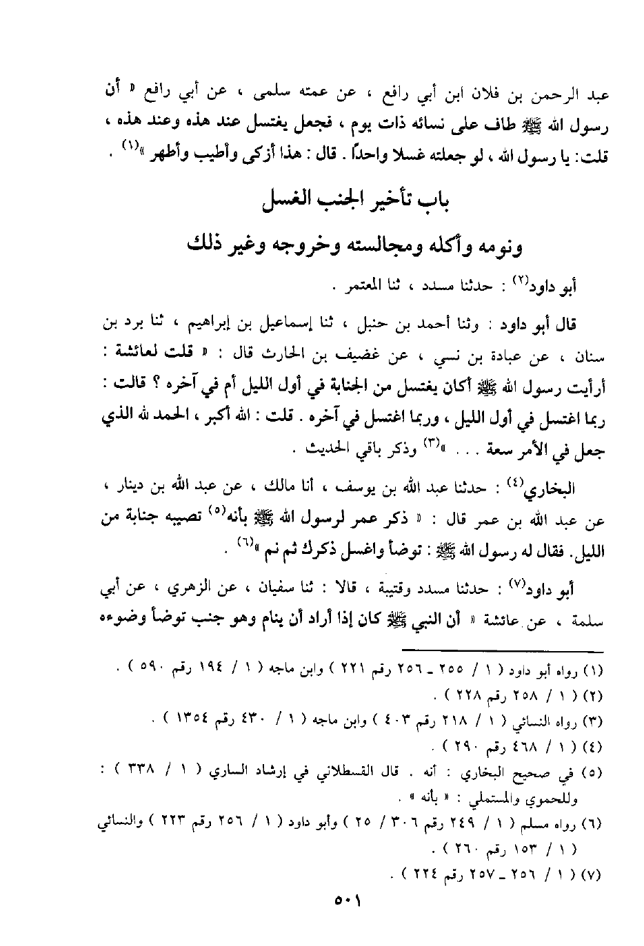 قَالَ أَبُو دَاوُد: وثنا أَحْمد بن حَنْبَل، ثَنَا إِسْمَاعِيل بن إِبْرَاهِيم، ثَنَا برد بن سِنَان، عَن عبَادَة بن نسي، عَن غُضَيْف بن الْحَارِث قَالَ: " قلت لعَائِشَة: أَرَأَيْت رَسُول الله - صَلَّى اللَّهُ عَلَيْهِ وَسَلَّم َ - أَكَانَ يغْتَسل من الْجَنَابَة فِي أول اللَّيْل أم فِي آخِره؟ قَالَت: رُبمَا اغْتسل فِي أول اللَّيْل، وَرُبمَا اغْتسل فِي آخِره. قلت: الله أكبر، الْحَمد لله الَّذِي جعل فِي الْأَمر سَعَة ... " وَذكر بَاقِي الحَدِيث.