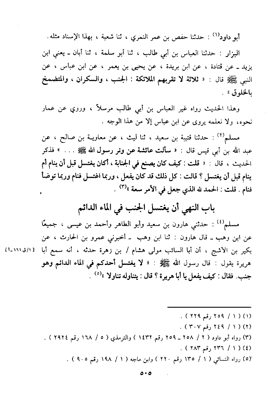 مُسلم: حَدثنِي هَارُون بن سعيد وَأَبُو الطَّاهِر وَأحمد بن عِيسَى، جَمِيعًا عَن ابْن وهب - قَالَ هَارُون: ثَنَا ابْن وهب - أَخْبرنِي عَمْرو بن الْحَارِث، عَن بكير بن الْأَشَج، أَن أَبَا السَّائِب مولى هِشَام / بن زهرَة حَدثهُ، أَنه سمع أَبَا هُرَيْرَة يَقُول: قَالَ رَسُول الله - صَلَّى اللَّهُ عَلَيْهِ وَسَلَّم َ -: " لَا يغْتَسل أحدكُم فِي المَاء الدَّائِم وَهُوَ جنب. فَقَالَ: كَيفَ يفعل يَا أَبَا هُرَيْرَة؟ قَالَ: يتَنَاوَلهُ تناولا ".