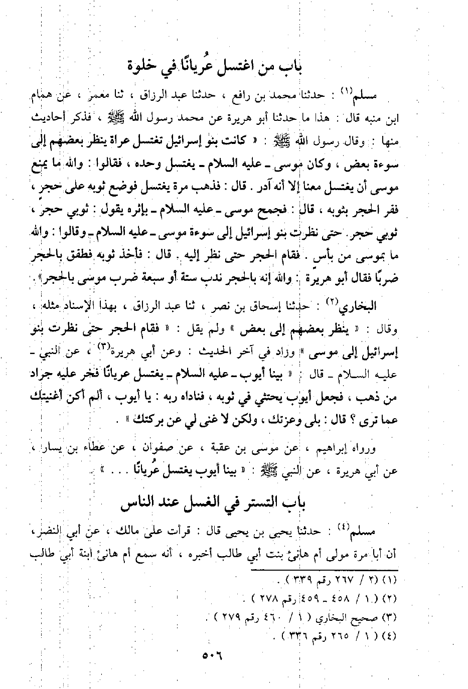 مُسلم: حَدثنَا مُحَمَّد بن رَافع، حَدثنَا عبد الرَّزَّاق، ثَنَا معمر، عَن همام ابْن مُنَبّه قَالَ: هَذَا مَا حَدثنَا أَبُو هُرَيْرَة عَن مُحَمَّد رَسُول الله - صَلَّى اللَّهُ عَلَيْهِ وَسَلَّم َ -، فَذكر أَحَادِيث مِنْهَا: وَقَالَ رَسُول الله - صَلَّى اللَّهُ عَلَيْهِ وَسَلَّم َ -: " كَانَت بَنو إِسْرَائِيل تَغْتَسِل عُرَاة ينظر بَعضهم إِلَى سوءة بعض، وَكَانَ مُوسَى - عَلَيْهِ السَّلَام - يغْتَسل وَحده، فَقَالُوا: وَالله مَا يمْنَع مُوسَى أَن يغْتَسل مَعنا إِلَّا أَنه آدر. قَالَ: فَذهب مرّة يغْتَسل فَوضع ثَوْبه على حجر، ففر الْحجر بِثَوْبِهِ، قَالَ: فجمح مُوسَى - عَلَيْهِ السَّلَام - بإثره يَقُول: ثوبي حجر، ثوبي حجر. حَتَّى نظرت بَنو إِسْرَائِيل إِلَى سوءة مُوسَى - عَلَيْهِ السَّلَام - وَقَالُوا: وَالله مَا بمُوسَى من بَأْس. فَقَامَ الْحجر حَتَّى نظر إِلَيْهِ. قَالَ: فَأخذ ثَوْبه فَطَفِقَ بِالْحجرِ ضربا فَقَالَ أَبُو هُرَيْرَة: وَالله إِنَّه بِالْحجرِ ندب سِتَّة أَو سَبْعَة ضرب مُوسَى بِالْحجرِ ".