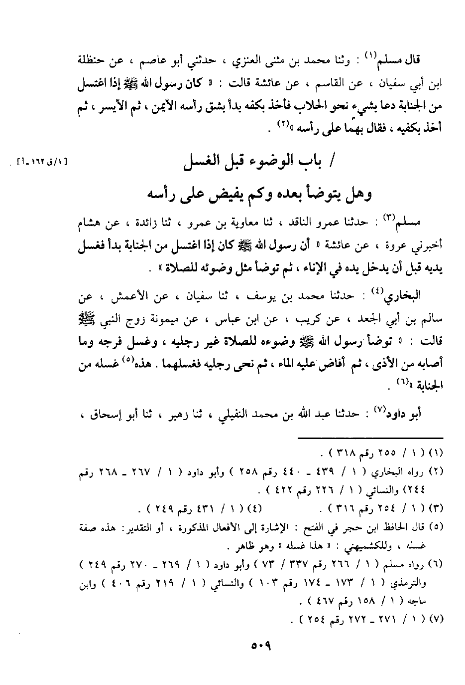 مُسلم: حَدثنَا عَمْرو النَّاقِد، ثَنَا مُعَاوِيَة بن عَمْرو، ثَنَا زَائِدَة، عَن هِشَام أَخْبرنِي عُرْوَة، عَن عَائِشَة " أَن رَسُول الله - صَلَّى اللَّهُ عَلَيْهِ وَسَلَّم َ - كَانَ إِذا اغْتسل من الْجَنَابَة بَدَأَ فَغسل يَدَيْهِ قبل أَن يدْخل يَده فِي الْإِنَاء، ثمَّ تَوَضَّأ مثل وضوئِهِ للصَّلَاة ".