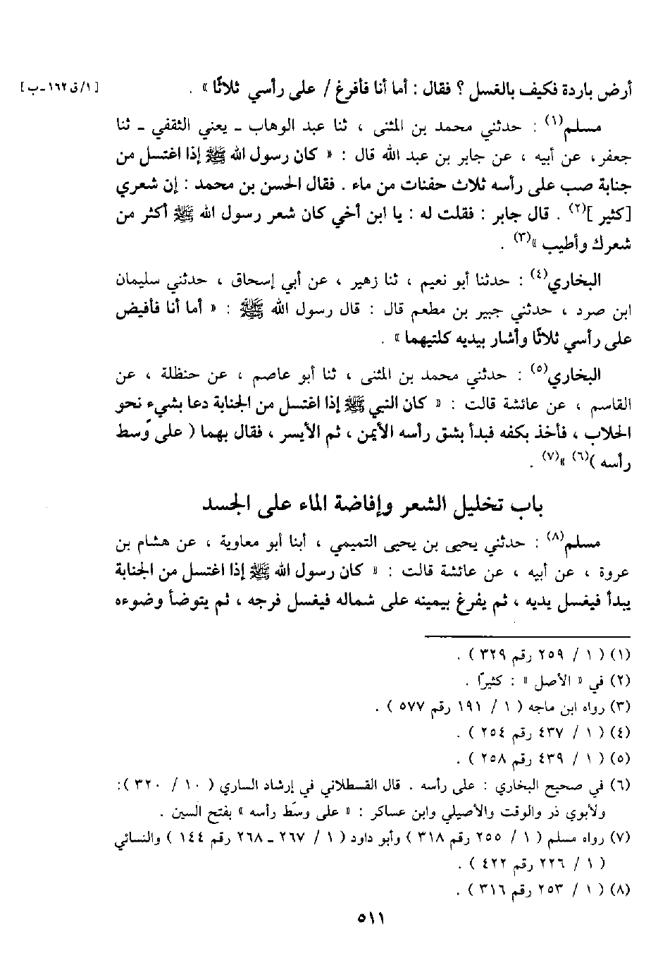 البُخَارِيّ: حَدثنَا أَبُو نعيم، ثَنَا زُهَيْر، عَن أبي إِسْحَاق، حَدثنِي سُلَيْمَان ابْن صرد، حَدثنِي جُبَير بن مطعم قَالَ: قَالَ رَسُول الله - صَلَّى اللَّهُ عَلَيْهِ وَسَلَّم َ -: " أما أَنا فأفيض على رَأْسِي ثَلَاثًا وَأَشَارَ بيدَيْهِ كلتيهما ".