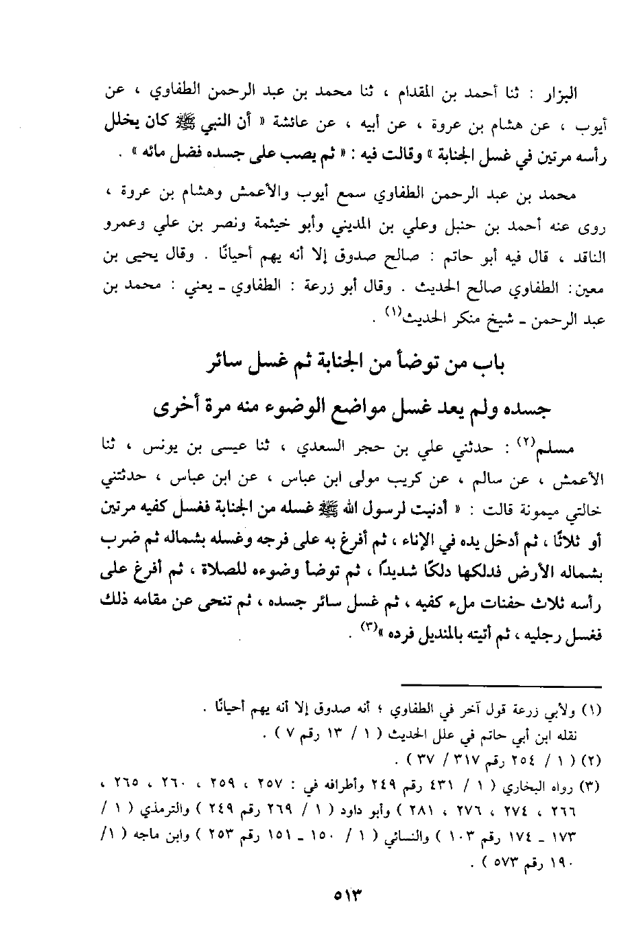 الْبَزَّار: ثَنَا أَحْمد بن الْمِقْدَام، ثَنَا مُحَمَّد بن عبد الرَّحْمَن الطفَاوِي، عَن أَيُّوب، عَن هِشَام بن عُرْوَة، عَن أَبِيه، عَن عَائِشَة " أَن النَّبِي - صَلَّى اللَّهُ عَلَيْهِ وَسَلَّم َ - كَانَ يخلل رَأسه مرَّتَيْنِ فِي غسل الْجَنَابَة " وَقَالَت فِيهِ: " ثمَّ يصب على جسده فضل مَائه ".