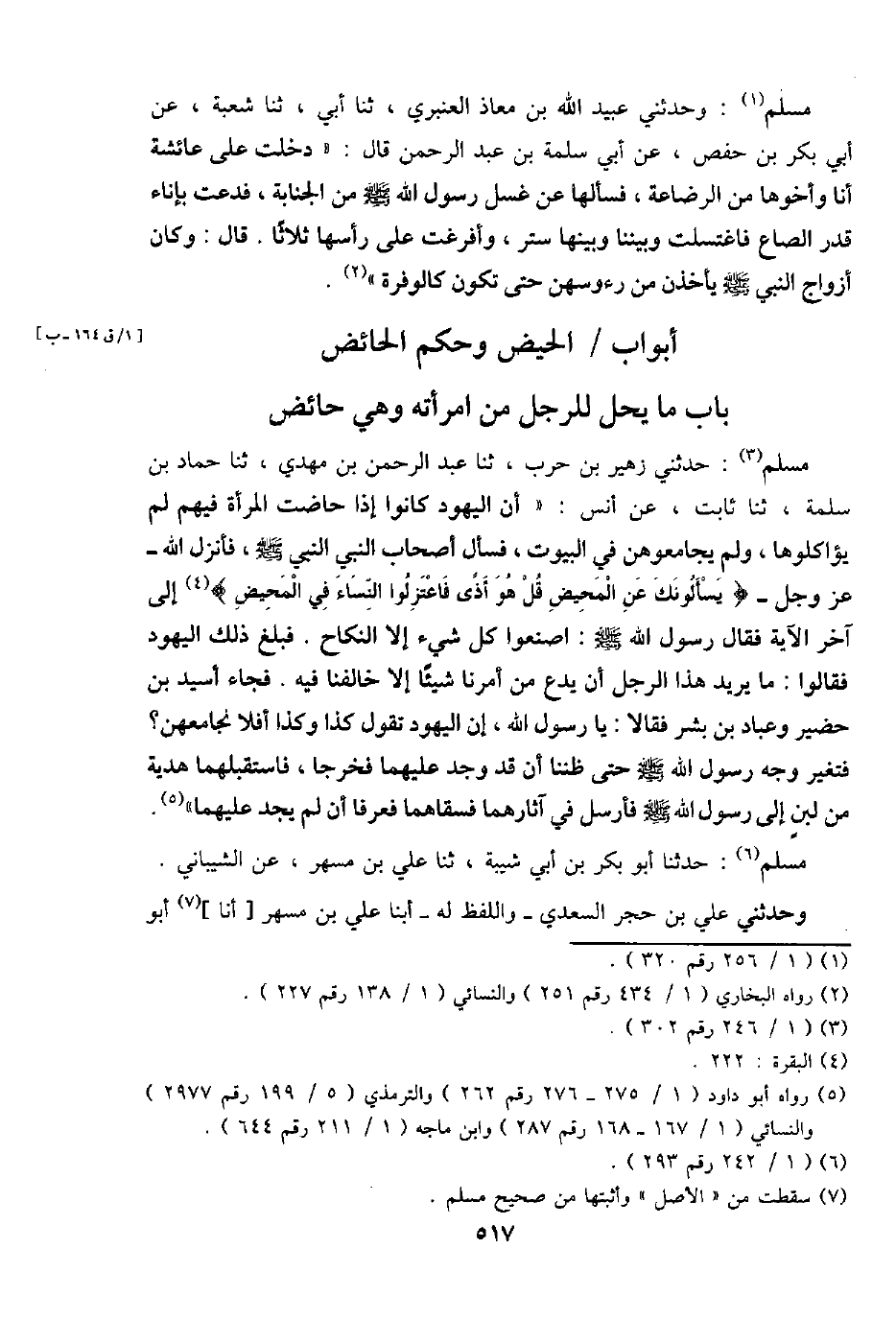 مُسلم: حَدثنِي زُهَيْر بن حَرْب، ثَنَا عبد الرَّحْمَن بن مهْدي، ثَنَا حَمَّاد بن سَلمَة، ثَنَا ثَابت، عَن أنس: " أَن الْيَهُود كَانُوا إِذا حَاضَت الْمَرْأَة فيهم لم يؤاكلوها، وَلم يجامعوهن فِي الْبيُوت، فَسَأَلَ أَصْحَاب النَّبِي النَّبِي - صَلَّى اللَّهُ عَلَيْهِ وَسَلَّم َ -، فَأنْزل الله - عز وَجل - {يَسْأَلُونَك عَن الْمَحِيض قل هُوَ أَذَى فاعتزلوا النِّسَاء فِي الْمَحِيض} إِلَى آخر الْآيَة فَقَالَ رَسُول الله - صَلَّى اللَّهُ عَلَيْهِ وَسَلَّم َ -: اصنعوا كل شَيْء إِلَّا النِّكَاح. فَبلغ ذَلِك الْيَهُود فَقَالُوا: مَا يُرِيد هَذَا الرجل أَن يدع من أمرنَا شَيْئا إِلَّا خَالَفنَا فِيهِ. فجَاء أسيد بن حضير وَعباد بن بشر فَقَالَا: يَا رَسُول الله، إِن الْيَهُود تَقول كَذَا وَكَذَا أَفلا نجامعهن؟ فَتغير وَجه رَسُول الله - صَلَّى اللَّهُ عَلَيْهِ وَسَلَّم َ - حَتَّى ظننا أَن قد وجد عَلَيْهِمَا فَخَرَجَا، فَاسْتَقْبَلَهُمَا هَدِيَّة من لبن إِلَى رَسُول الله - صَلَّى اللَّهُ عَلَيْهِ وَسَلَّم َ - فَأرْسل فِي آثارهما فَسَقَاهُمَا فعرفا أَن لم يجد عَلَيْهِمَا ".