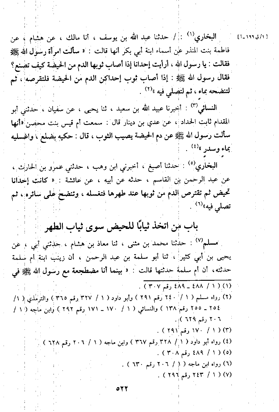 البُخَارِيّ: / حَدثنَا عبد الله بن يُوسُف، أَنا مَالك، عَن هِشَام، عَن فَاطِمَة بنت الْمُنْذر عَن أَسمَاء ابْنة أبي بكر أَنَّهَا قَالَت: " سَأَلت امْرَأَة رَسُول الله - صَلَّى اللَّهُ عَلَيْهِ وَسَلَّم َ - فَقَالَت: يَا رَسُول الله، أَرَأَيْت إحدانا إِذا أصَاب ثوبها الدَّم من الْحَيْضَة كَيفَ تصنع؟ فَقَالَ رَسُول الله - صَلَّى اللَّهُ عَلَيْهِ وَسَلَّم َ -: إِذا أصَاب ثوب إحداكن الدَّم من الْحَيْضَة فلتقرصه، ثمَّ لتنضحه بِمَاء، ثمَّ لتصلي فِيهِ ".