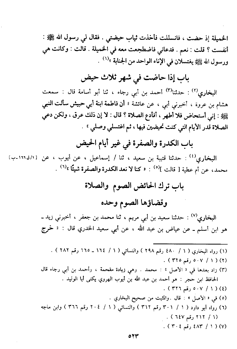 البُخَارِيّ: حَدثنَا أَحْمد بن أبي رَجَاء، ثَنَا أَبُو أُسَامَة قَالَ: سَمِعت هِشَام بن عُرْوَة، أَخْبرنِي أبي، عَن عَائِشَة " أَن فَاطِمَة ابْنة أبي حيبش سَأَلت النَّبِي - صَلَّى اللَّهُ عَلَيْهِ وَسَلَّم َ -: إِنِّي أسْتَحَاض فَلَا أطهر، أفأدع الصَّلَاة؟ قَالَ: لَا إِن ذَلِك عرق، وَلَكِن دعِي الصَّلَاة قدر الْأَيَّام الَّتِي كنت تحيضين فِيهَا، ثمَّ اغْتَسِلِي وَصلي ".