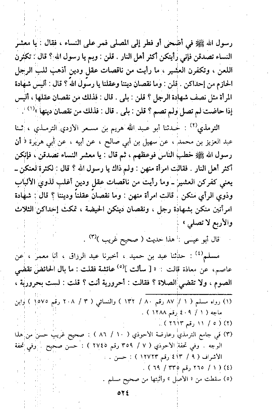 التِّرْمِذِيّ: حَدثنَا أَبُو عبد الله هريم بن مسعر الْأَزْدِيّ التِّرْمِذِيّ، ثَنَا عبد الْعَزِيز بن مُحَمَّد، عَن سُهَيْل بن أبي صَالح، عَن أَبِيه، عَن أبي هُرَيْرَة " أَن رَسُول الله - صَلَّى اللَّهُ عَلَيْهِ وَسَلَّم َ - خطب النَّاس فوعظهم، ثمَّ قَالَ: يَا معشر النِّسَاء تصدقن، فَإِنَّكُنَّ أَكثر أهل النَّار. فَقَالَت امْرَأَة مِنْهُنَّ: وَلم ذَاك يَا رَسُول الله؟ قَالَ: لِكَثْرَة لعنكن - يَعْنِي كفركن العشير - وَمَا رَأَيْت من ناقصات عقل وَدين أغلب لِذَوي الْأَلْبَاب وَذَوي الرَّأْي مِنْكُن. قَالَت امْرَأَة مِنْهُنَّ: وَمَا نُقْصَان عقلنا وَدِيننَا؟ قَالَ: شَهَادَة امْرَأتَيْنِ مِنْكُم بِشَهَادَة رجل، ونقصان دينكن الْحَيْضَة، تمكث إحداكن الثَّلَاث والأربع لَا تصلي ".