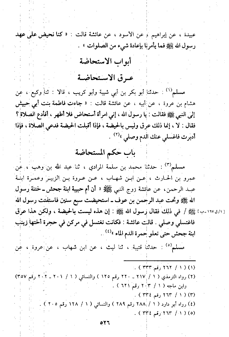 مُسلم: حَدثنَا أَبُو بكر بن أبي شيبَة وَأَبُو كريب، قَالَا: ثَنَا وَكِيع، عَن هِشَام بن عُرْوَة، عَن أَبِيه، عَن عَائِشَة قَالَت: " جَاءَت فَاطِمَة بنت أبي حُبَيْش إِلَى النَّبِي - صَلَّى اللَّهُ عَلَيْهِ وَسَلَّم َ - فَقَالَت: يَا رَسُول الله، إِنِّي امْرَأَة أسْتَحَاض فَلَا أطهر، أفأدع الصَّلَاة؟ فَقَالَ: لَا، إِنَّمَا ذَلِك عرق وَلَيْسَ بالحيضة، فَإِذا أَقبلت الْحَيْضَة فدعي الصَّلَاة، فَإِذا أَدْبَرت فاغسلي عَنْك الدَّم وَصلي ".