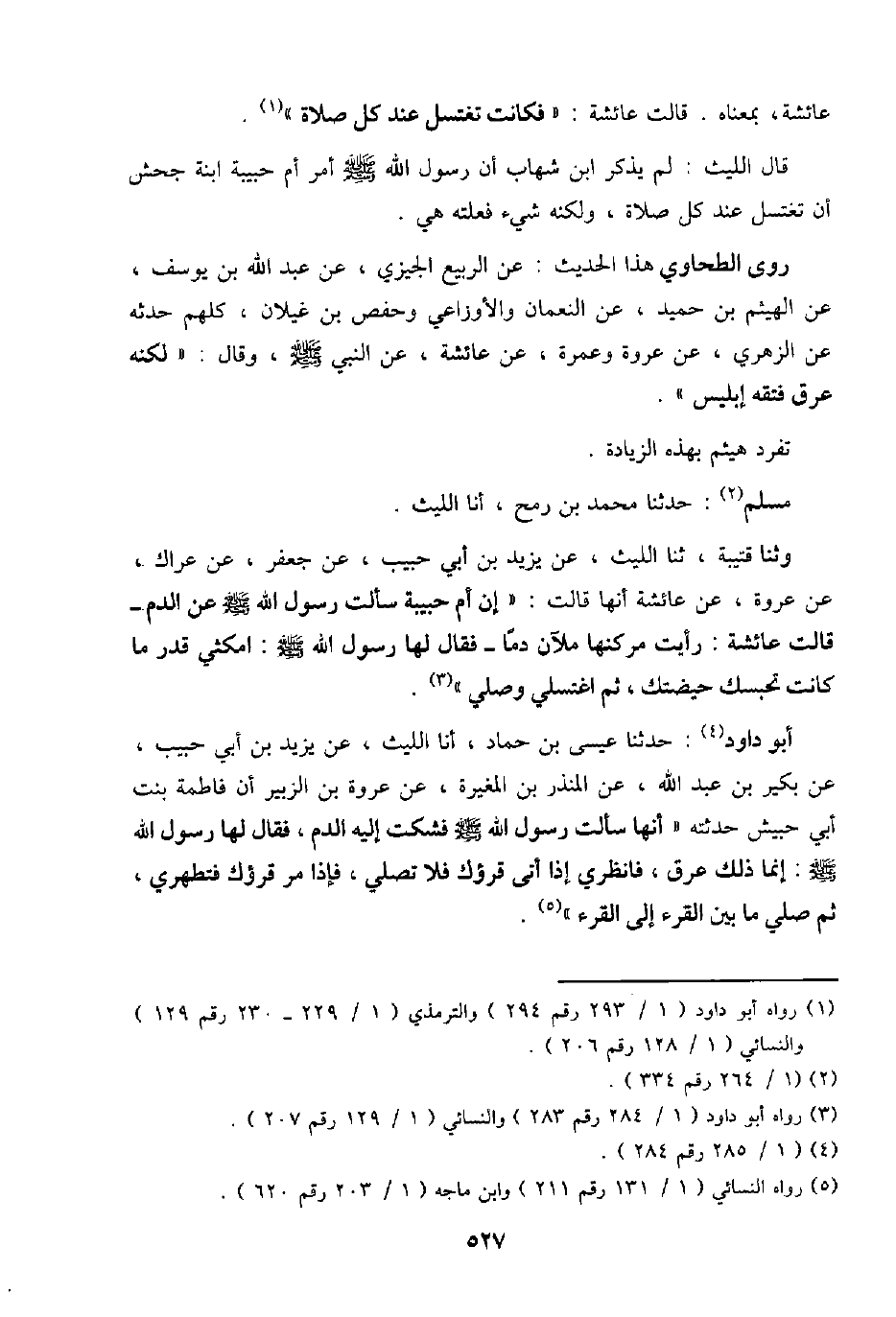 وثنا قُتَيْبَة، ثَنَا اللَّيْث، عَن يزِيد بن أبي حبيب، عَن جَعْفَر، عَن عرَاك، عَن عُرْوَة، عَن عَائِشَة أَنَّهَا قَالَت: " إِن أم حَبِيبَة سَأَلت رَسُول الله - صَلَّى اللَّهُ عَلَيْهِ وَسَلَّم َ - عَن الدَّم - قَالَت عَائِشَة: رَأَيْت مركنها ملآن دَمًا - فَقَالَ لَهَا رَسُول الله - صَلَّى اللَّهُ عَلَيْهِ وَسَلَّم َ -: امكثي قدر مَا كَانَت تحبسك حيضتك، ثمَّ اغْتَسِلِي وَصلي ".