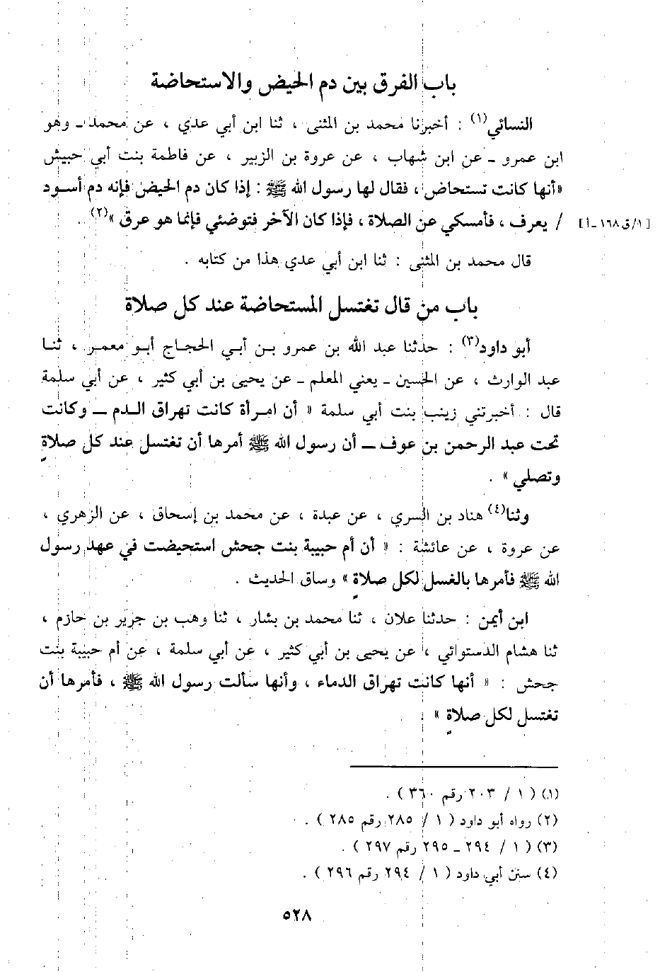 وثنا هناد بن السّري، عَن عَبدة، عَن مُحَمَّد بن إِسْحَاق، عَن الزُّهْرِيّ، عَن عُرْوَة، عَن عَائِشَة: " أَن أم حَبِيبَة بنت جحش استحيضت فِي عهد رَسُول الله - صَلَّى اللَّهُ عَلَيْهِ وَسَلَّم َ - فَأمرهَا بِالْغسْلِ لكل صَلَاة " وسَاق الحَدِيث.