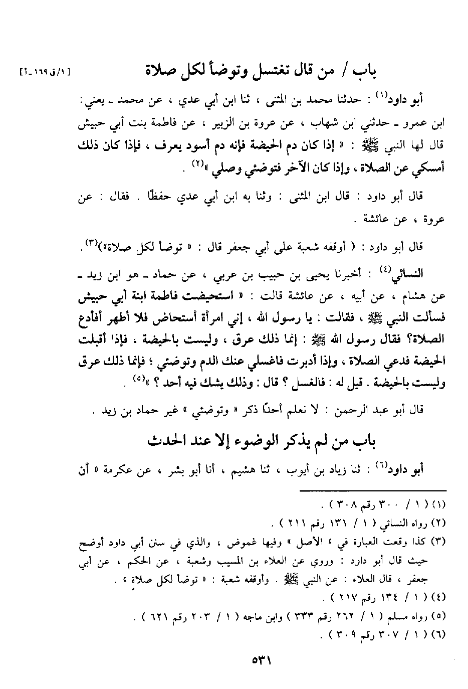 النَّسَائِيّ: أخبرنَا يحيى بن حبيب بن عَرَبِيّ، عَن حَمَّاد - هُوَ ابْن زيد - عَن هِشَام، عَن أَبِيه، عَن عَائِشَة قَالَت: " استحيضت فَاطِمَة ابْنة أبي حُبَيْش فَسَأَلت النَّبِي - صَلَّى اللَّهُ عَلَيْهِ وَسَلَّم َ -، فَقَالَت: يَا رَسُول الله، إِنِّي امْرَأَة أسْتَحَاض فَلَا أطهر أفأدع الصَّلَاة؟ فَقَالَ رَسُول الله - صَلَّى اللَّهُ عَلَيْهِ وَسَلَّم َ -: إِنَّمَا ذَلِك عرق، وَلَيْسَت بالحيضة، فَإِذا أَقبلت الْحَيْضَة فدعي الصَّلَاة، وَإِذا أَدْبَرت فاغسلي عَنْك الدَّم وتوضئي؛ فَإِنَّمَا ذَلِك عرق وَلَيْسَت بالحيضة. قيل لَهُ: فالغسل؟ قَالَ: وَذَلِكَ يشك فِيهِ أحد؟ ".