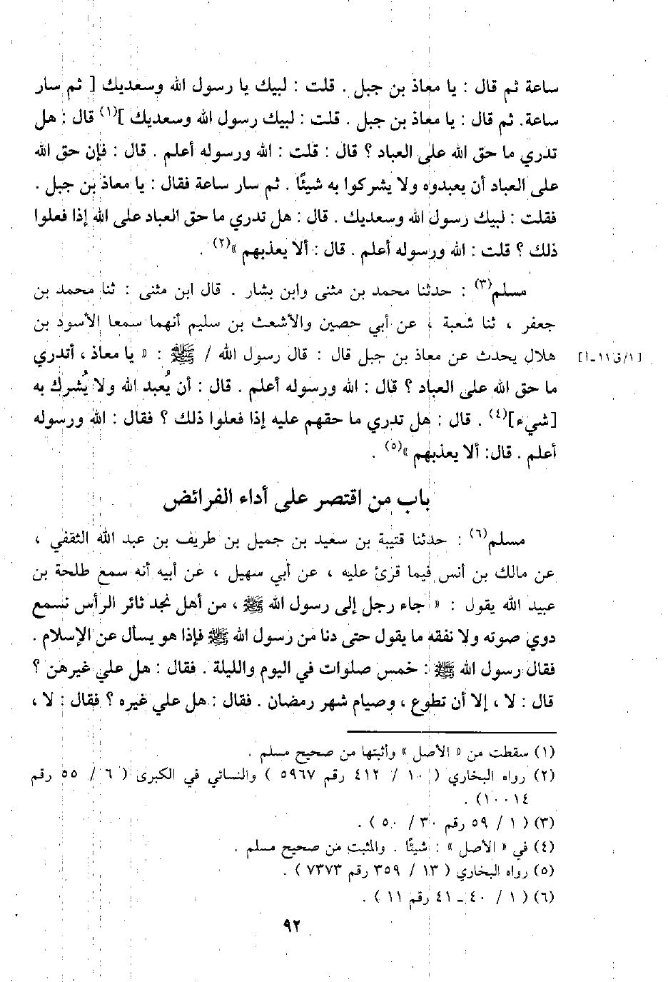 مُسلم: حَدثنَا مُحَمَّد بن مثنى وَابْن بشار. قَالَ ابْن مثنى: ثَنَا مُحَمَّد بن جَعْفَر، ثَنَا شُعْبَة، عَن أبي حُصَيْن والأشعث بن سليم أَنَّهُمَا سمعا الْأسود بن هِلَال يحدث عَن معَاذ بن جبل قَالَ: قَالَ رَسُول الله / - صَلَّى اللَّهُ عَلَيْهِ وَسَلَّم َ -: " يَا معَاذ، أَتَدْرِي مَا حق الله على الْعباد؟ قَالَ: الله وَرَسُوله أعلم. قَالَ: أَن يعبد الله وَلَا يُشْرك بِهِ [شَيْء] . قَالَ: هَل تَدْرِي مَا حَقهم عَلَيْهِ إِذا فعلوا ذَلِك؟ فَقَالَ: الله وَرَسُوله أعلم. قَالَ: أَلا يعذبهم ".