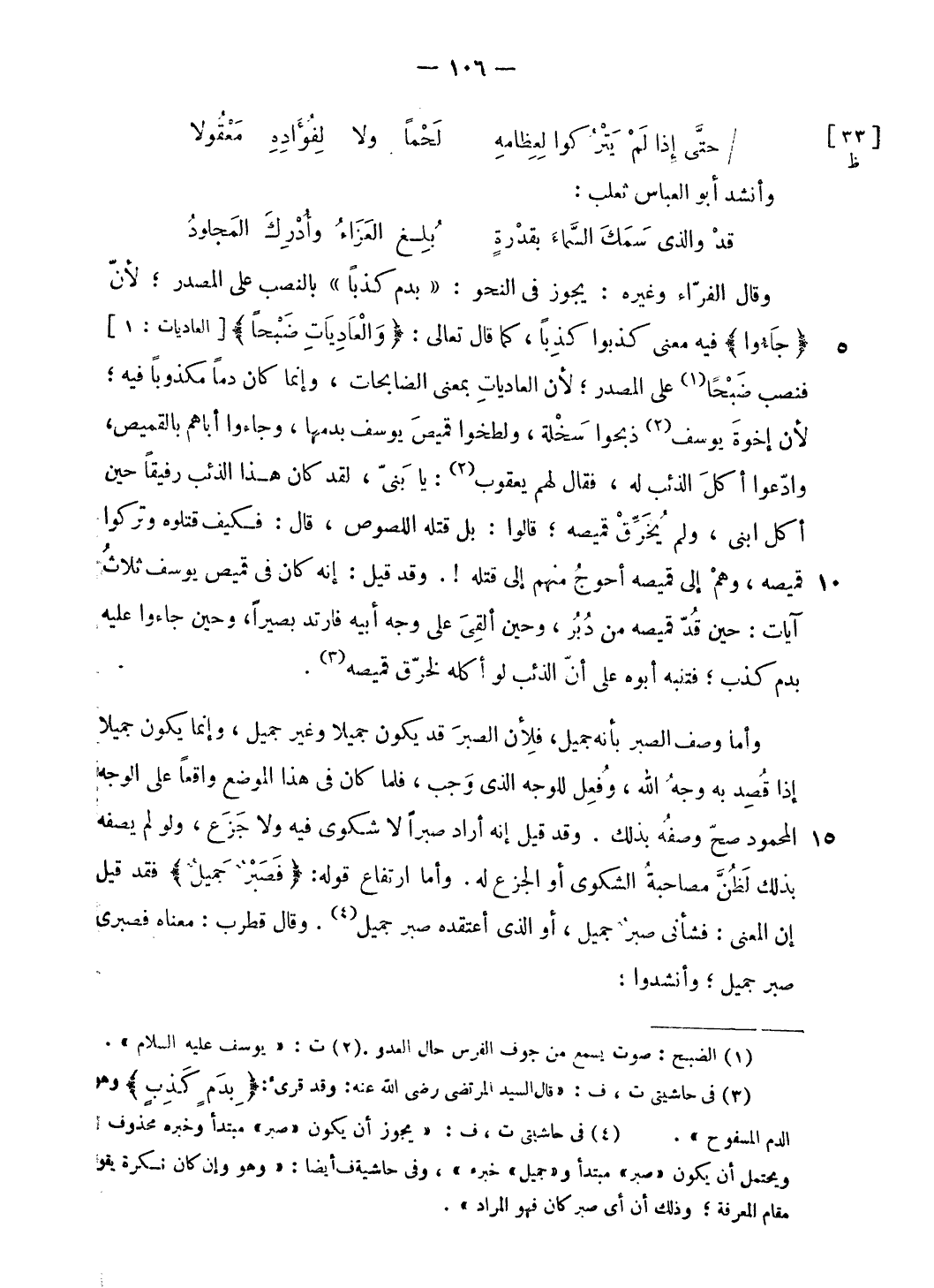 (¬4) فى حاشيتى ت، ف: «يجوز أن يكون «صبر» مبتدأ وخبره محذوف، ويحتمل أن يكون «صبر» مبتدأ و «جميل» خبره»، وفى حاشية ف أيضا: «وهو وإن كان نكرة يقوم مقام المعرفة؛ وذلك أن أى صبر كان فهو المراد».