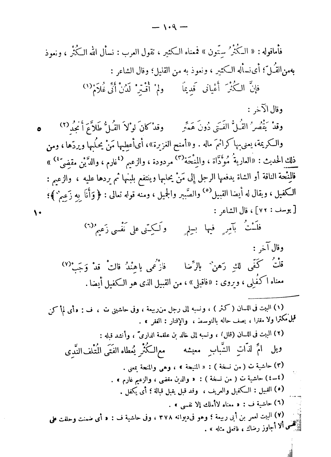 فأما قوله: «الكثر ستّون» فمعناه الكثير، تقول العرب: نسأل الله الكثر، ونعوذ به من القلّ؛ أى نسأله الكثير، ونعوذ به من القليل؛ وقال الشاعر: