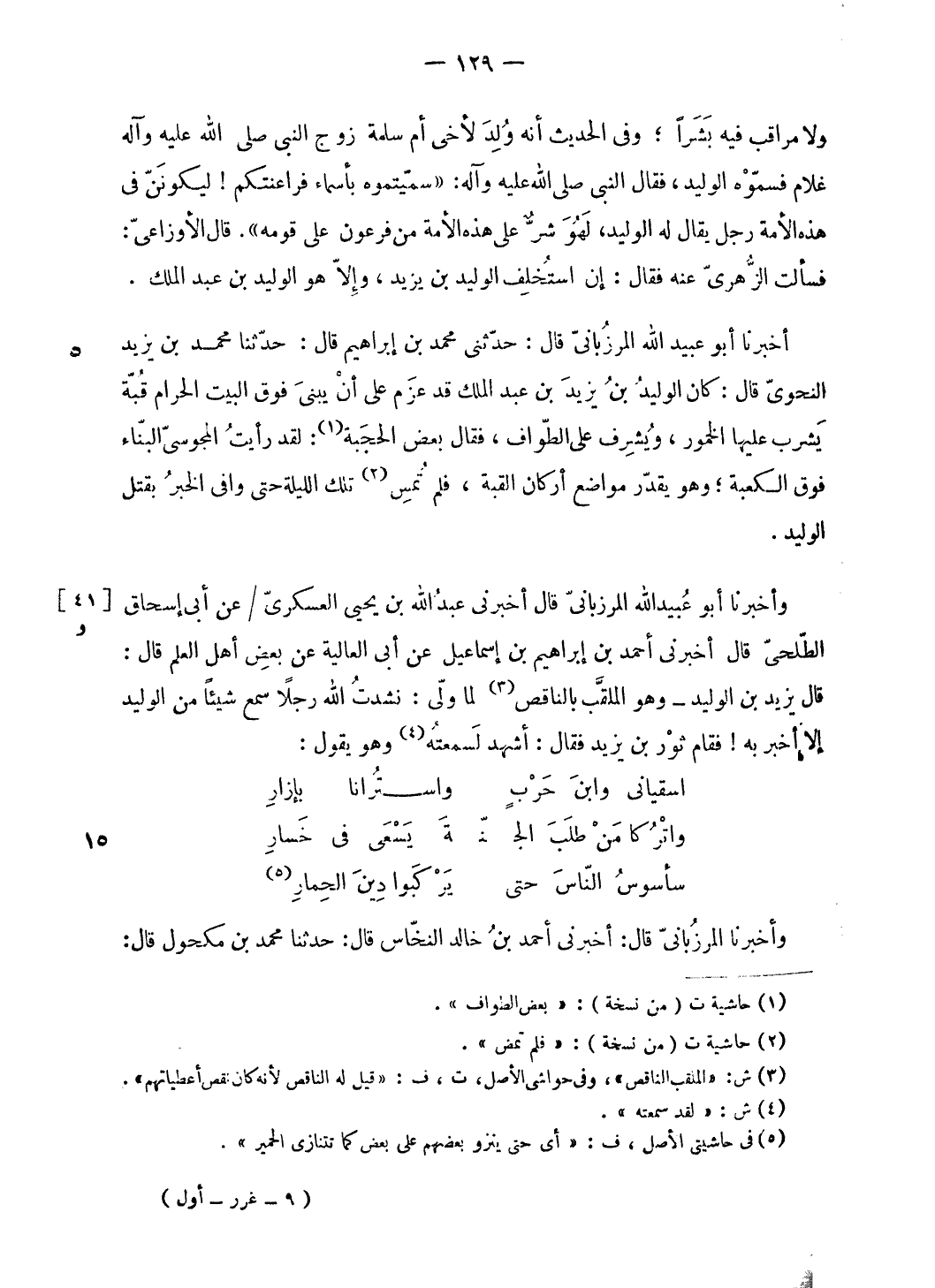 وأخبرنا أبو عبيد الله المرزبانىّ قال أخبرنى عبد الله بن يحيى العسكرىّ/ عن أبى إسحاق الطّلحىّ قال أخبرنى أحمد بن إبراهيم بن إسماعيل عن أبى العالية عن بعض أهل العلم قال: