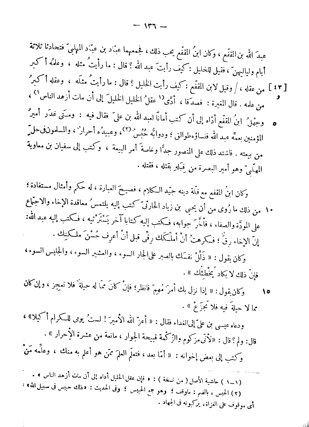عبد الله بن المقفّع، وكان ابن المقفّع يحب ذلك، فجمعهما عبّاد بن عبّاد المهلبىّ فتحادثا ثلاثة أيام ولياليهنّ، فقيل للخليل: كيف رأيت عبد الله؟ قال: ما رأيت مثله، وعلمه أكبر من عقله، / وقيل لابن المقفّع: كيف رأيت الخليل؟ قال: ما رأيت مثله، وعقله أكبر من علمه. قال المغيرة: فصدقا، أدّى [عقل الخليل الخليل إلى أن مات أزهد الناس] (¬1)، وجهل ابن المقفّع أدّاه إلى أن كتب أمانا لعبد الله بن عليّ فقال فيه: ومتى غدر أمير المؤمنين بعمّه عبد الله فنساؤه طوالق؛ ودوابّه حبس (¬2)، وعبيده أحرار، والمسلمون فى حلّ من بيعته. فاشتد ذلك على المنصور جدّا وخاصة أمر البيعة، وكتب إلى سفيان بن معاوية المهلّبىّ وهو أمير البصرة من قبله بقتله، فقتله.