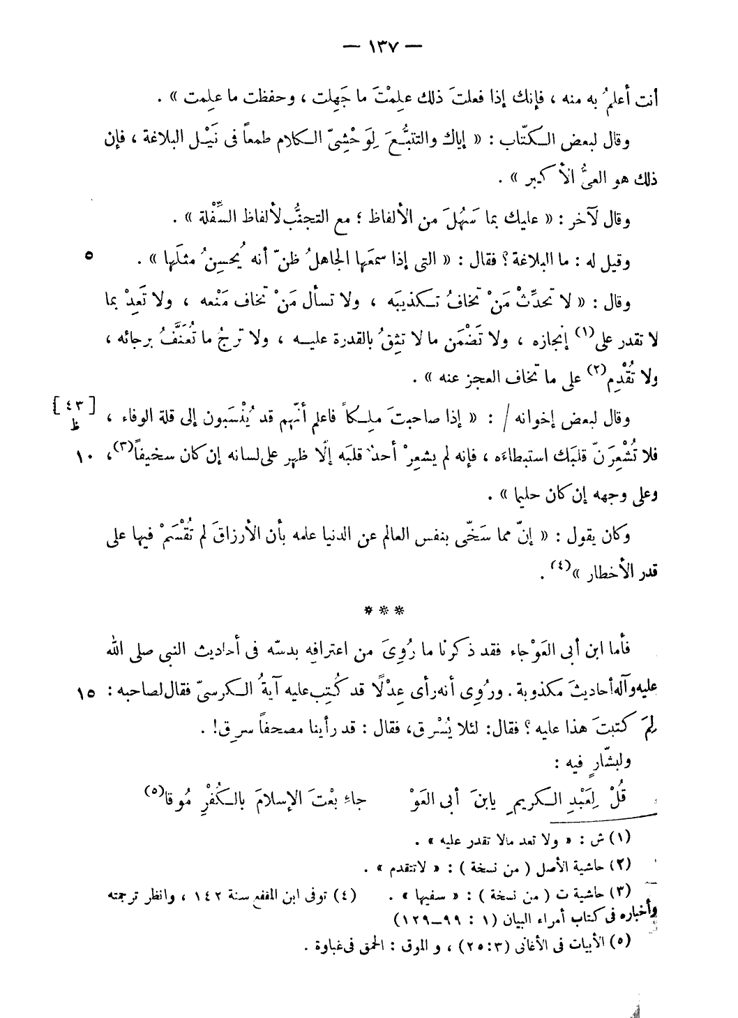 (¬4) توفى ابن المقفع سنة 142، وانظر ترجمته وأخباره فى كتاب أمراء البيان (1: 99 - 129).