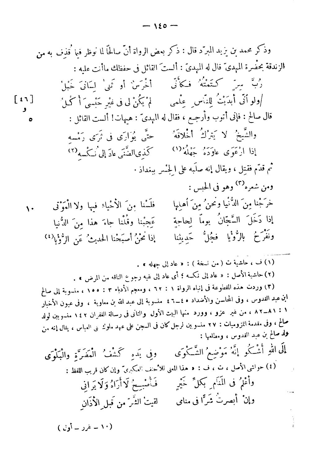 (¬3) وردت هذه المقطوعة فى إنباه الرواة 1: 62، ومعجم الأدباء 3: 155، منسوبة إلى صالح ابن عبد القدوس، وفى المحاسن والأضداد 45 - 46 منسوبة إلى عبد الله بن معاوية، وفى عيون الأخبار 1: 81 - 82، من غير عزو، وورد منها البيت الأول والثانى فى رسالة الغفران 142 منسوبين لولد صالح، وفى مقدمة اللزوميات: 27 منسوبين لرجل كان فى السجن على عهد ملوك بنى العباس، يقال إنه من ولد صالح بن عبد القدوس، ومطلعها:
