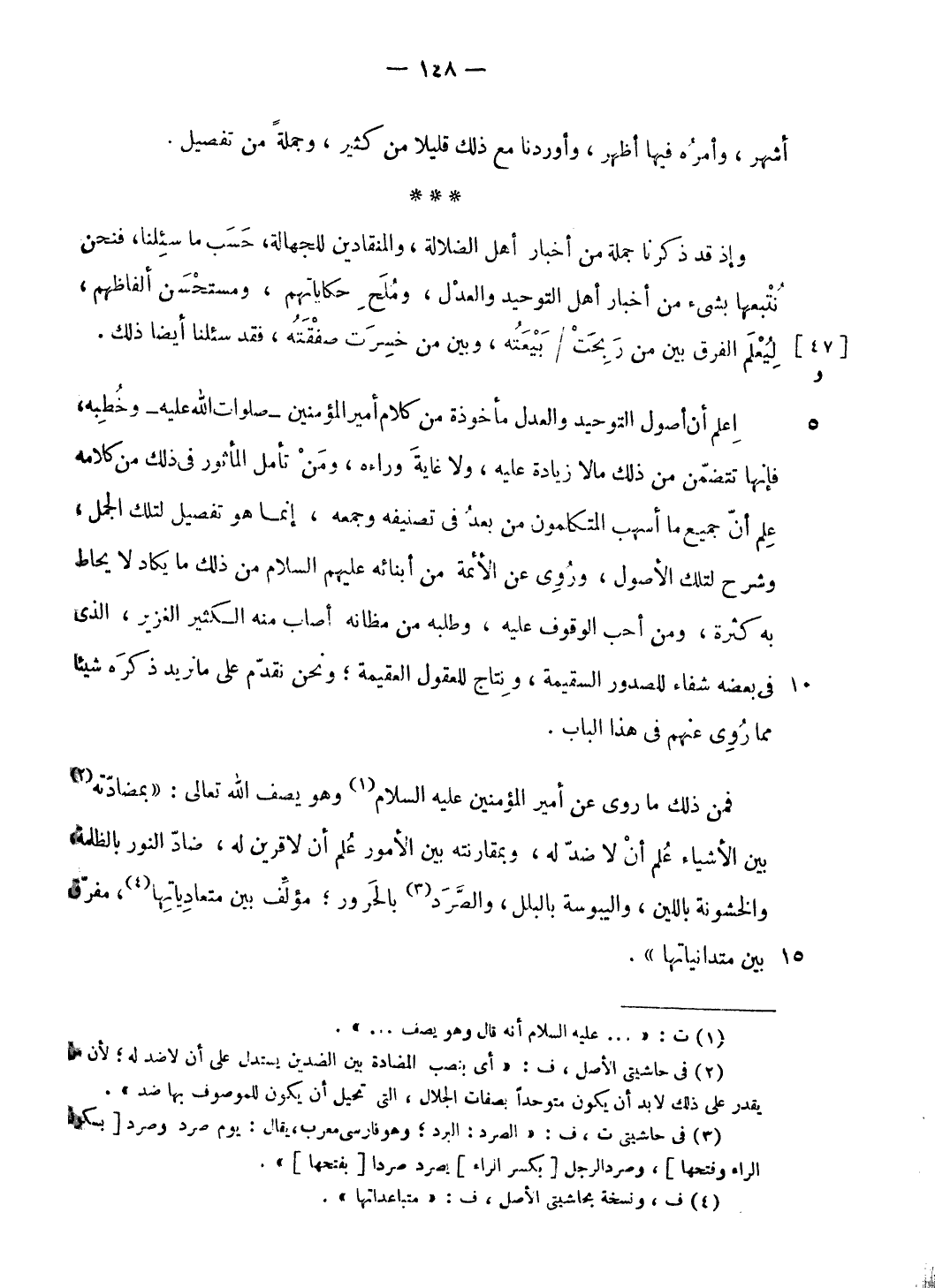 اعلم أن أصول التوحيد والعدل مأخوذة من كلام أمير المؤمنين- صلوات الله عليه- وخطبه، فإنها تتضمّن من ذلك ما لا زيادة عليه، ولا غاية وراءه، ومن تأمل المأثور فى ذلك من كلامه علم أنّ جميع ما أسهب المتكلمون من بعد فى تصنيفه وجمعه، إنما هو تفصيل لتلك الجمل، وشرح لتلك الأصول، وروى عن الأئمة من أبنائه عليهم السلام من ذلك ما يكاد لا يحاط به كثرة، ومن أحب الوقوف عليه، وطلبه من مظانه أصاب منه الكثير الغزير، الّذي فى بعضه شفاء للصدور السقيمة، ونتاج للعقول العقيمة؛ ونحن نقدّم على ما نريد ذكره شيئا مما روى عنهم فى هذا الباب.