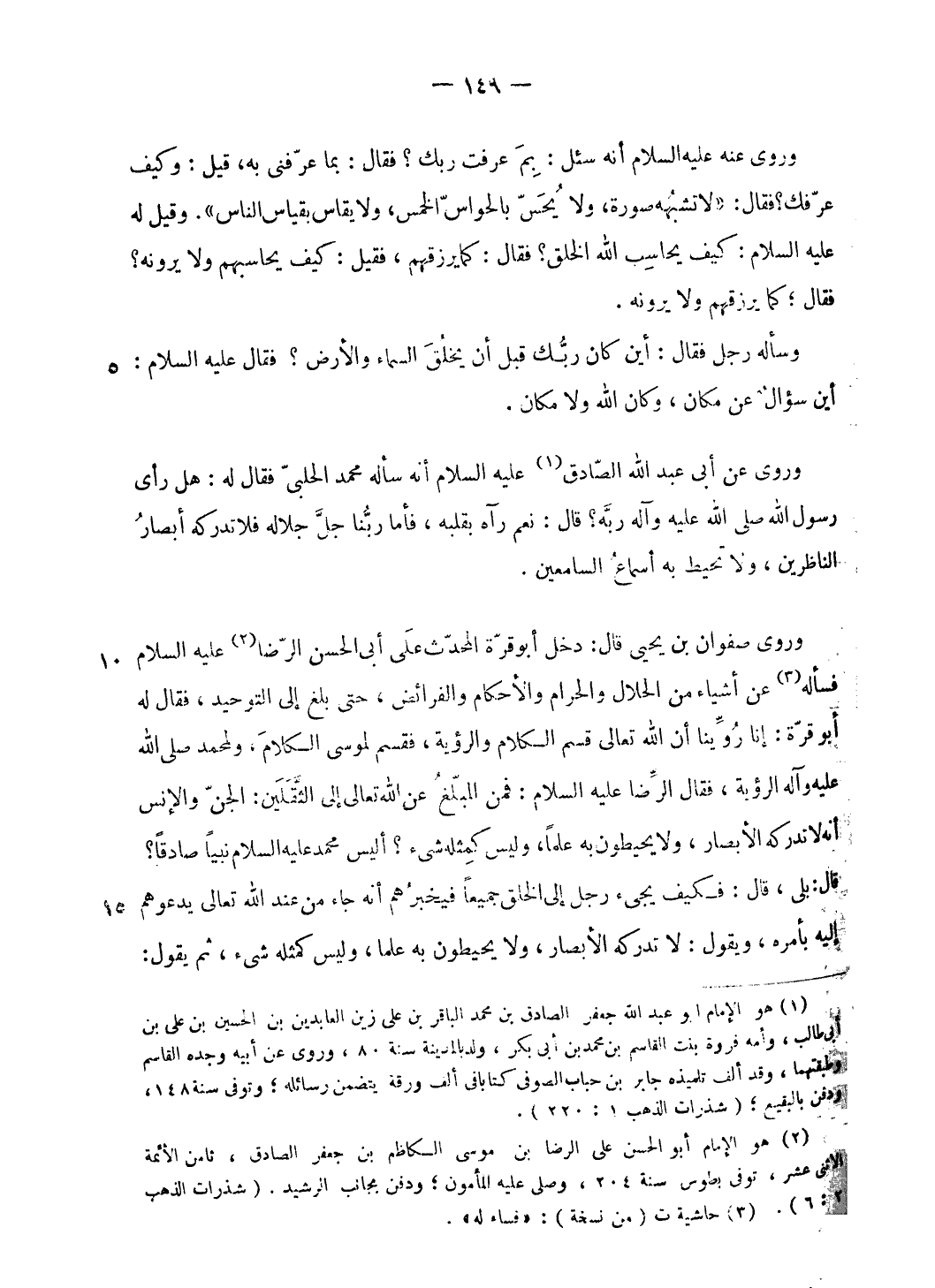 وروى صفوان بن يحيى قال: دخل أبو قرّة المحدّث على أبى الحسن الرّضا (¬2) عليه السلام فسأله (¬3) عن أشياء من الحلال والحرام والأحكام والفرائض، حتى بلغ إلى التوحيد، فقال له أبو قرّة: إنا روّينا أن الله تعالى قسم الكلام والرؤية، فقسم لموسى الكلام، ولمحمد صلى الله عليه وآله الرؤية، فقال الرّضا عليه السلام: فمن المبلّغ عن الله تعالى إلى الثّقلين: الجنّ والإنس أنه لا تدركه الأبصار، ولا يحيطون به علما، وليس كمثله شيء؟ أليس محمد عليه السلام نبيا صادقا؟