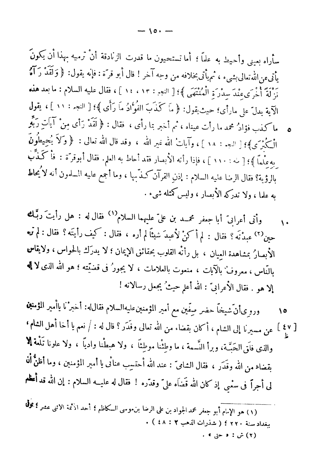 سأراه بعينى وأحيط به علما؛ أما تستحيون ما قدرت الزنادقة أن ترميه بهذا أن يكون يأتى عن الله تعالى بشيء، ثم يأتى بخلافه من وجه آخر! قال أبو قرّة: فإنه يقول: وَلَقَدْ رَآهُ نَزْلَةً أُخْرى عِنْدَ سِدْرَةِ الْمُنْتَهى؛ [النجم: 13، 14]، فقال عليه السلام: ما بعد هذه الآية يدلّ على ما رأى؛ حيث يقول: ما كَذَبَ الْفُؤادُ ما رَأى؛ [النجم: 11]، يقول ما كذب فؤاد محمد ما رأت عيناه، ثم أخبر بما رأى، فقال: لَقَدْ رَأى مِنْ آياتِ رَبِّهِ الْكُبْرى؛ [النجم: 18]، وآيات الله غير الله، وقد قال الله تعالى: وَلا يُحِيطُونَ بِهِ عِلْماً؛ [طه: 110]، فإذا رأته الأبصار فقد أحاط به العلم. فقال أبو قرّة: فأكذّب بالرؤية؟ فقال الرضا عليه السلام: إذن القرآن كذّبها، وما أجمع عليه المسلمون أنه لا يحاط به علما، ولا تدركه الأبصار، وليس كمثله شيء.