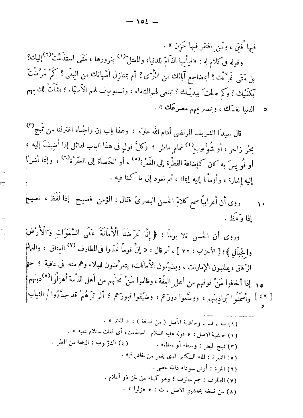 وروى أن الحسن تلا يوما: إِنَّا عَرَضْنَا الْأَمانَةَ عَلَى السَّماواتِ وَالْأَرْضِ وَالْجِبالِ؛ [الأحزاب: 72]، ثم قال: «إنّ قوما غدوا فى المطارف (¬7) العتاق، والعمائم الرّقاق، يطلبون الإمارات، ويضيّعون الأمانات، يتعرّضون للبلاء وهم منه فى عافية؛ حتى إذا أخافوا من فوقهم من أهل العفّة، وظلموا من تحتهم من أهل الذمّة أهزلوا (¬8) دينهم، وأسمنوا براذينهم، ووسّعوا دورهم، وضيّقوا قبورهم؛ ألم ترهم قد جدّدوا/ الثياب،