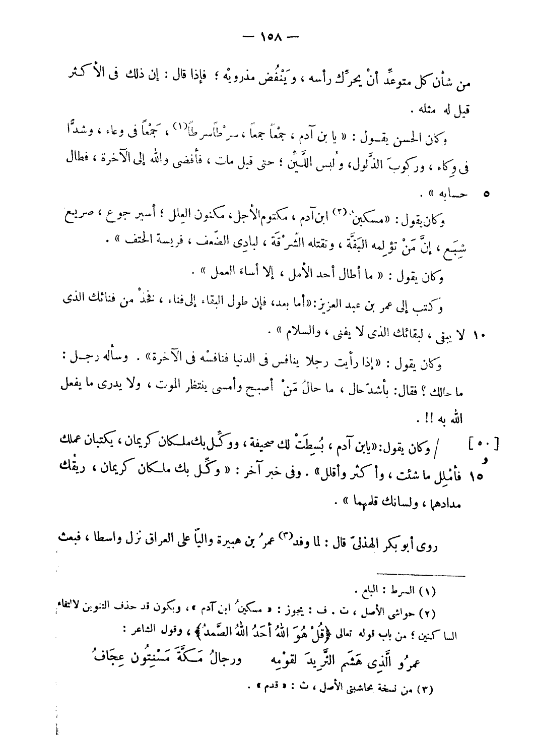 (¬2) حواشى الأصل، ت. ف: يجوز: «مسكين ابن آدم»، ويكون قد حذف التنوين لالتقاء الساكنين؛ من باب قوله تعالى قُلْ هُوَ اللَّهُ أَحَدٌ اللَّهُ الصَّمَدُ، وقول الشاعر: