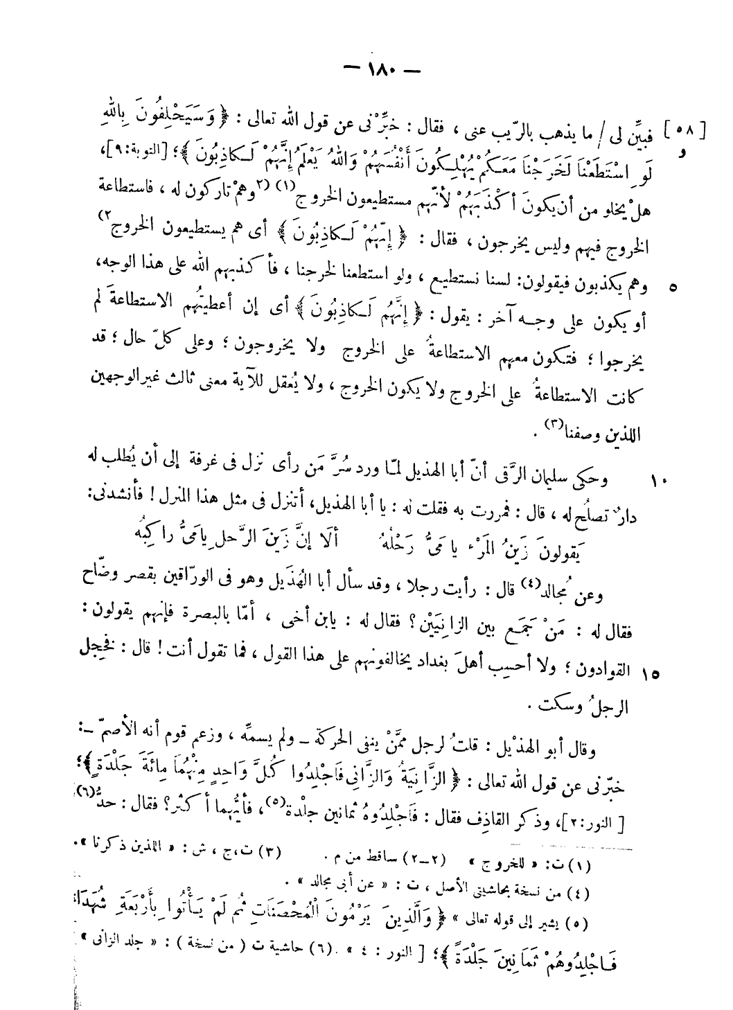 فبيّن لى/ ما يذهب بالرّيب عنى، فقال: خبّرنى عن قول الله تعالى: وَسَيَحْلِفُونَ بِاللَّهِ لَوِ اسْتَطَعْنا لَخَرَجْنا مَعَكُمْ يُهْلِكُونَ أَنْفُسَهُمْ وَاللَّهُ يَعْلَمُ إِنَّهُمْ لَكاذِبُونَ؛ [التوبة: 42]، هل يخلو من أن يكون أكذبهم لأنّهم مستطيعون الخروج (¬1) [وهم تاركون له، فاستطاعة الخروج فيهم وليس يخرجون، فقال: إِنَّهُمْ لَكاذِبُونَ أى هم يستطيعون الخروج] (¬2) وهم يكذبون فيقولون: لسنا نستطيع، ولو استطعنا لخرجنا، فأكذبهم الله على هذا الوجه، أو يكون على وجه آخر: يقول: إِنَّهُمْ لَكاذِبُونَ أى إن أعطيتهم الاستطاعة لم يخرجوا؛ فتكون معهم الاستطاعة على الخروج ولا يخرجون؛ وعلى