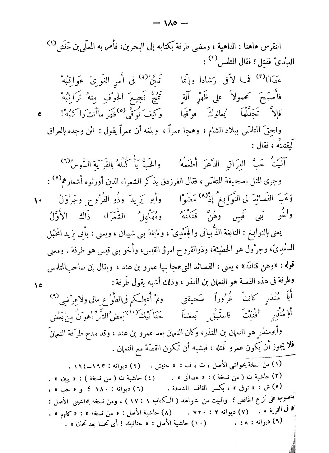 يعنى بالنوابغ: النابغة الذّبيانى والجعدىّ، ونابغة بنى شيبان، ويعنى: بأبى يزيد المخبّل السعدىّ، وجرول هو الحطيئة، وذو القروح امرؤ القيس، وأخو بنى قيس هو طرفة. ومعنى قوله: «وهن قتلنه»، يعنى: القصائد التى هجا بها عمرو بن هند، ويقال إن صاحب المتلمس وطرفة فى هذه القصة هو النعمان بن المنذر، وذلك أشبه بقول طرفة: