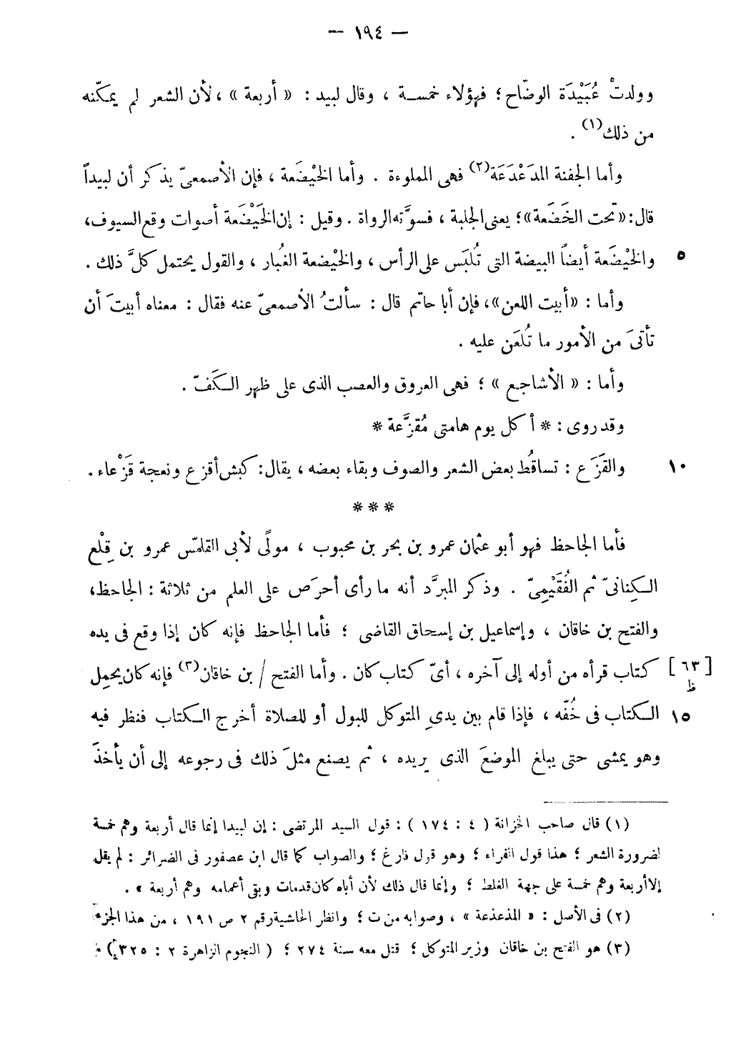 فأما الجاحظ فهو أبو عثمان عمرو بن بحر بن محبوب، مولى لأبى القلمّس عمرو بن قلع الكنانىّ ثم الفقيمىّ. وذكر المبرّد أنه ما رأى أحرص على العلم من ثلاثة: الجاحظ، والفتح بن خاقان، وإسماعيل بن إسحاق القاضى؛ فأما الجاحظ فإنه كان إذا وقع فى يده كتاب قرأه من أوله إلى آخره، أىّ كتاب كان. وأما الفتح/ بن خاقان (¬3) فإنه كان يحمل الكتاب فى خفّه، فإذا قام بين يدى المتوكل للبول أو للصلاة أخرج الكتاب فنظر فيه وهو يمشى حتى يبلغ الموضع الّذي يريده، ثم يصنع مثل ذلك فى رجوعه إلى أن يأخذ