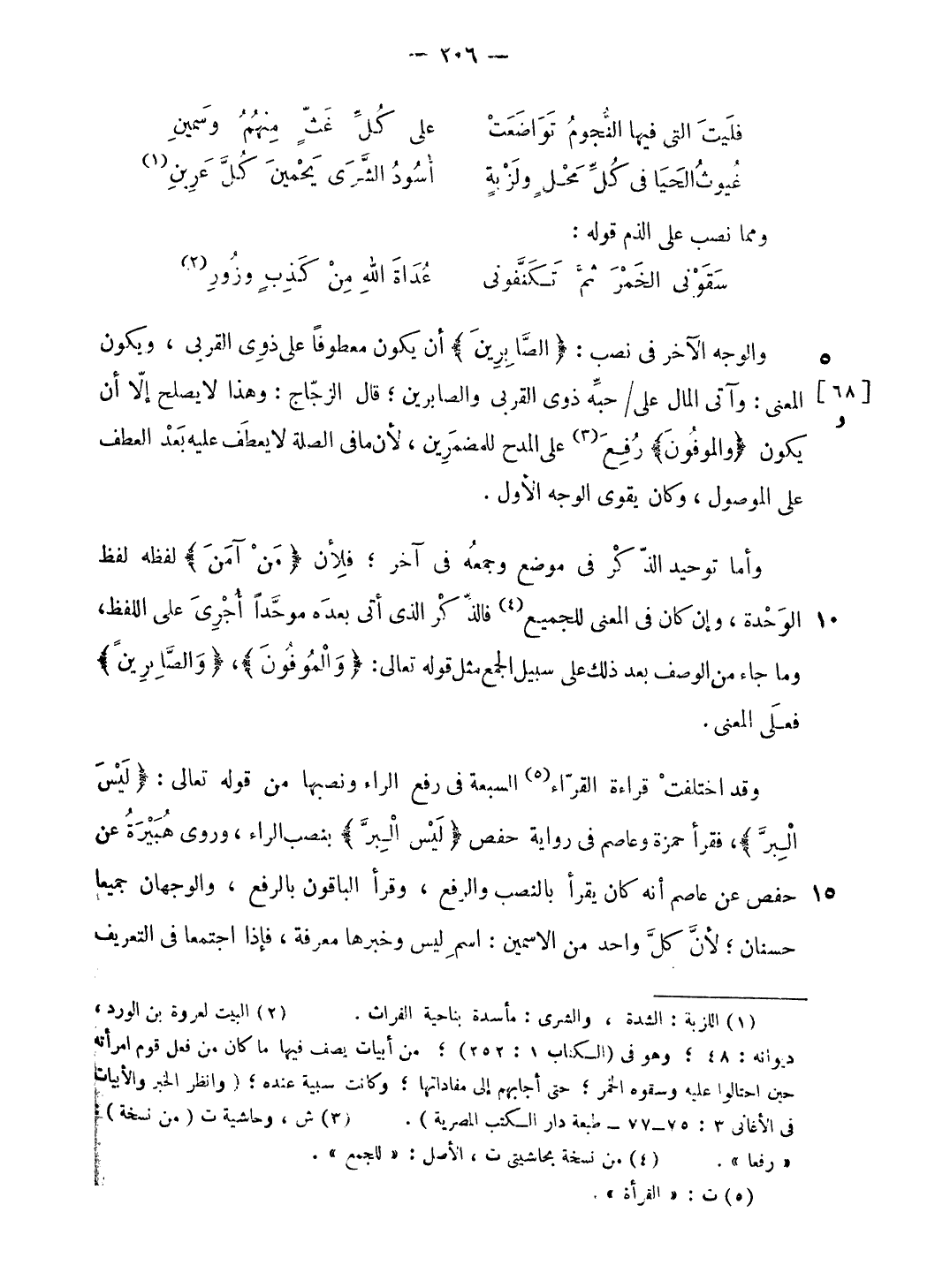 والوجه الآخر فى نصب: الصَّابِرِينَ أن يكون معطوفا على ذوى القربى، ويكون المعنى: وآتى المال على/ حبّه ذوى القربى والصابرين؛ قال الزجّاج: وهذا لا يصلح إلّا أن يكون وَالْمُوفُونَ رفع (¬3) على المدح للمضمرين، لأن ما فى الصلة لا يعطف عليه بعد العطف على الموصول، وكان يقوى الوجه الأول.