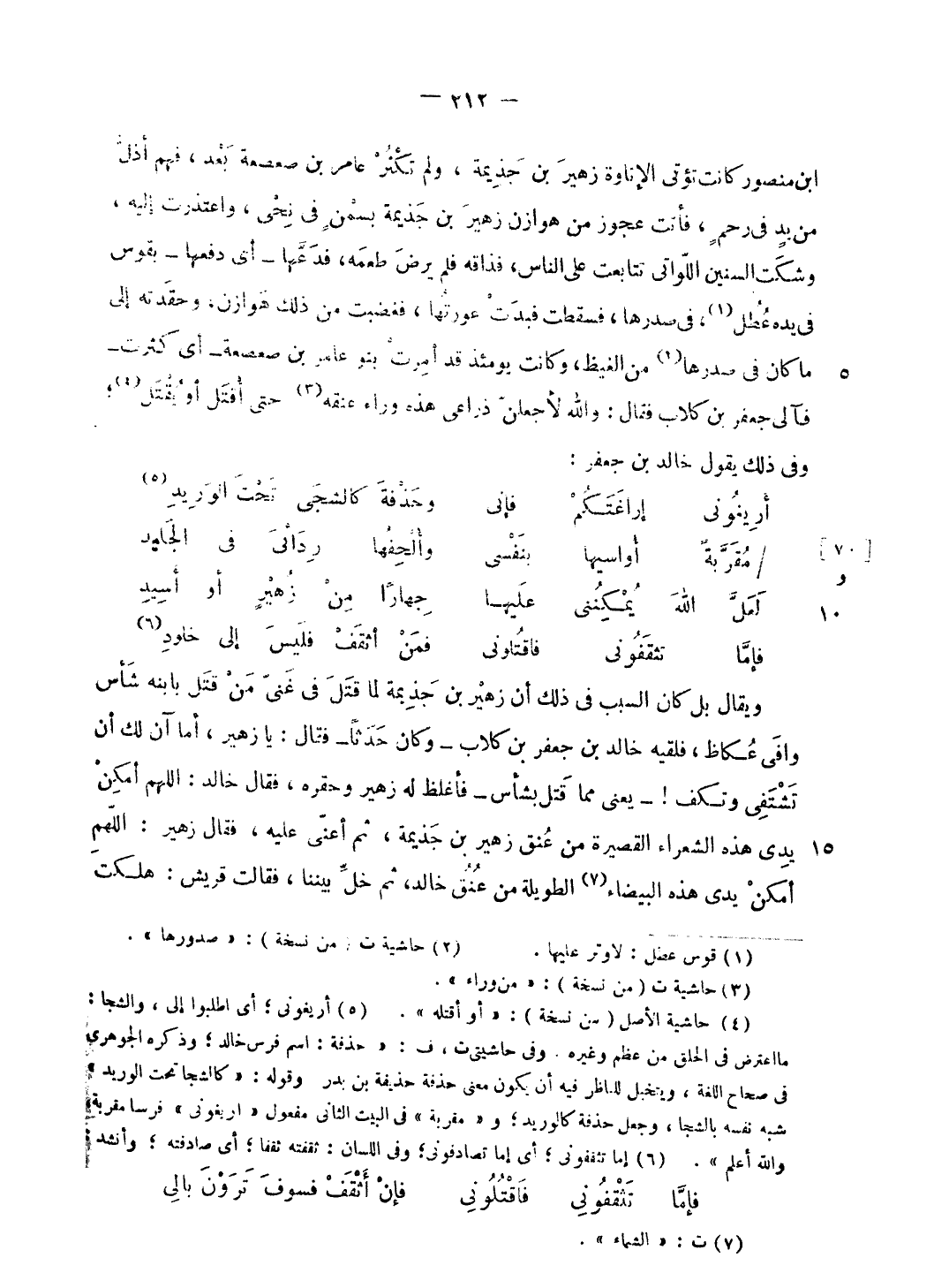 ابن منصور كانت تؤتى الإتاوة زهير بن جذيمة، ولم تكثر عامر بن صعصعة بعد، فهم أذلّ من يد فى رحم، فأتت عجوز من هوازن زهير بن جذيمة بسمن فى نحى، واعتذرت إليه، وشكت السنين اللّواتى تتابعت على الناس، فذاقه فلم يرض طعمه، فدعّها- أى دفعها- بقوس فى يده عطل (¬1)، فى صدرها، فسقطت فبدت عورتها، فغضبت من ذلك هوازن، وحقدته إلى ما كان فى صدرها (¬2) من الغيظ، وكانت يومئذ قد أمرت بنو عامر بن صعصعة- أى كثرت- فآلى جعفر بن كلاب فقال: والله لأجعلنّ ذراعى هذه وراء عنقه (¬3) حتى أقتل أو يقتل (¬4)؛ وفى ذلك يقول خالد بن جعفر: