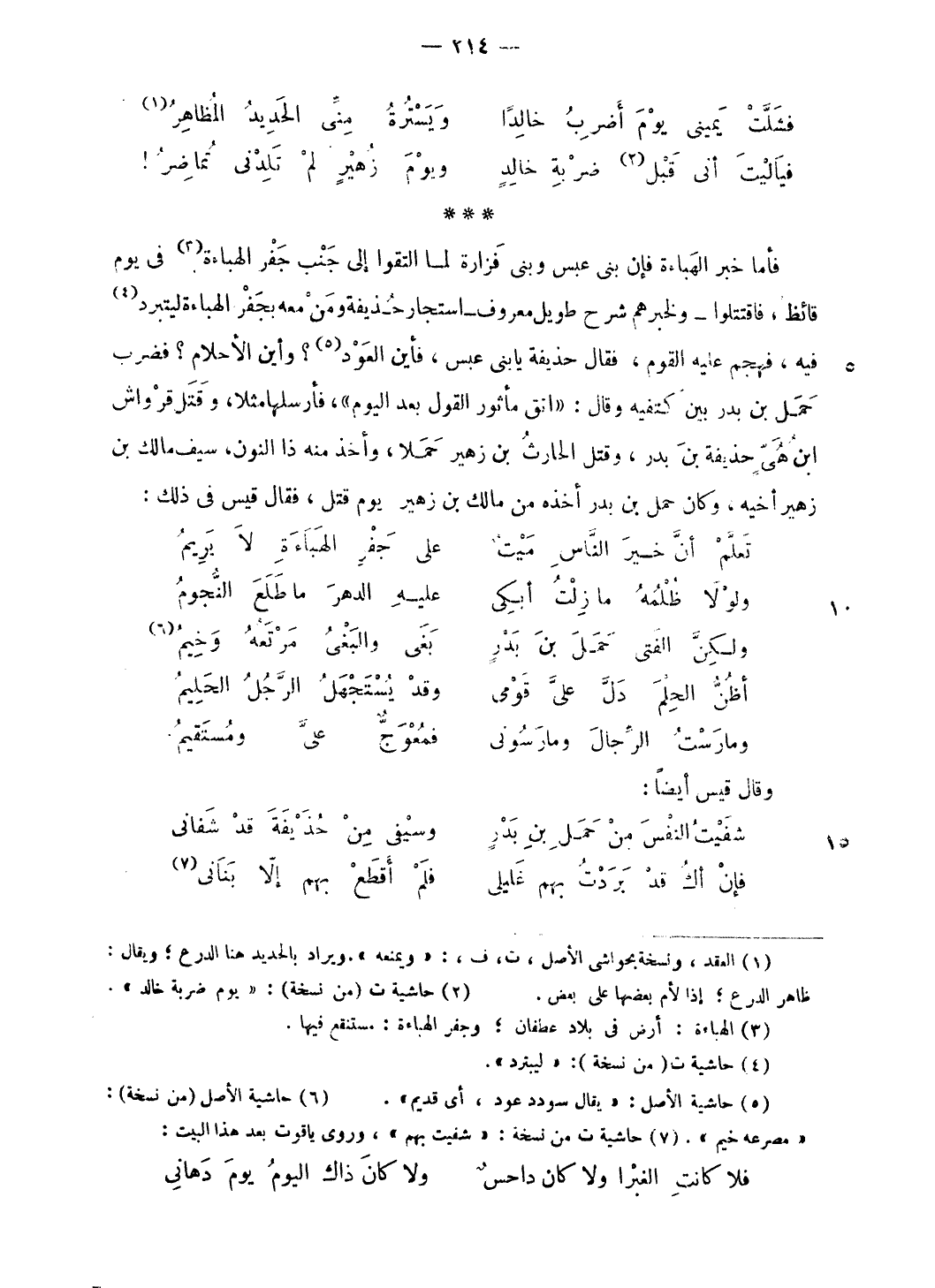 فأما خبر الهباءة فإن بنى عبس وبنى فزارة لما التقوا إلى جنب جفر الهباءة (¬3) فى يوم قائظ، فاقتتلوا- ولخبرهم شرح طويل معروف- استجار حذيفة ومن معه بجفر الهباءة ليتبرد (¬4) فيه، فهجم عليه القوم، فقال حذيفة يا بنى عبس، فأين العود (¬5)؟ وأين الأحلام؟ فضرب حمل بن بدر بين كنفيه وقال: «اتق مأثور القول بعد اليوم»، فأرسلها مثلا، وقتل قرواش ابن هىّ حذيفة بن بدر، وقتل الحارث بن زهير حملا، وأخذ منه ذا النون، سيف مالك بن زهير أخيه، وكان حمل بن بدر أخذه من مالك بن زهير يوم قتل، فقال قيس فى ذلك: