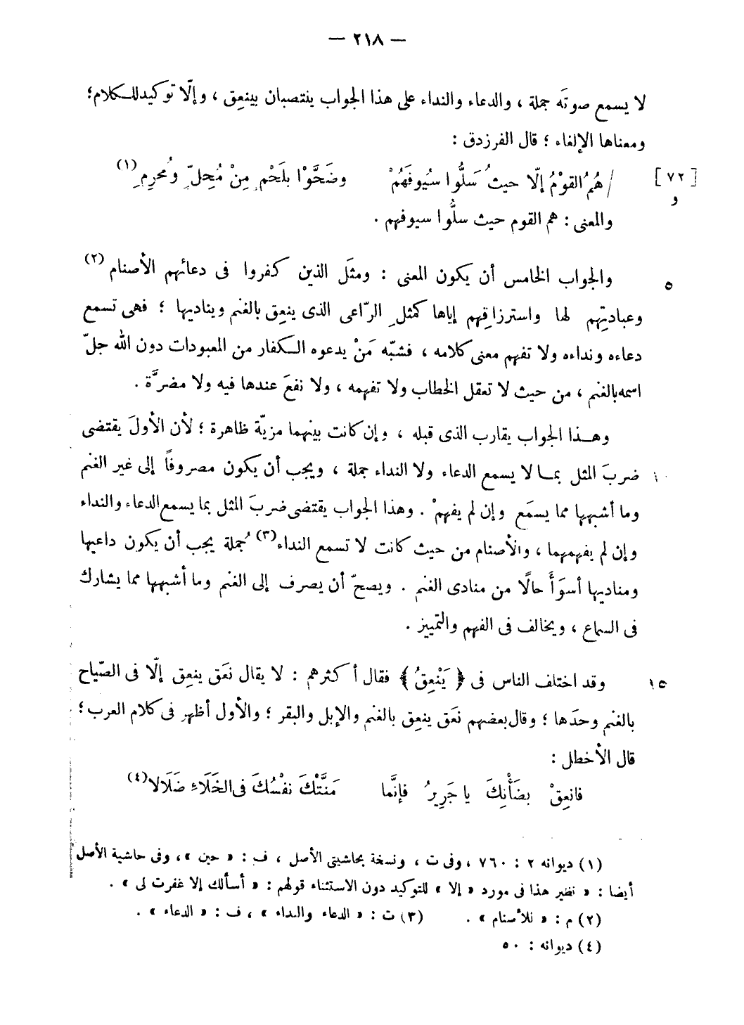 وهذا الجواب يقارب الّذي قبله، وإن كانت بينهما مزيّة ظاهرة؛ لأن الأول يقتضي ضرب المثل بما لا يسمع الدعاء ولا النداء جملة، ويجب أن يكون مصروفا إلى غير الغنم وما أشبهها مما يسمع وإن لم يفهم. وهذا الجواب يقتضي ضرب المثل بما يسمع الدعاء والنداء وإن لم يفهمهما، والأصنام من حيث كانت لا تسمع النداء (¬3) جملة يجب أن يكون داعيها ومناديها أسوأ حالا من منادى الغنم. ويصحّ أن يصرف إلى الغنم وما أشبهها مما يشارك فى السماع، ويخالف فى الفهم والتمييز.