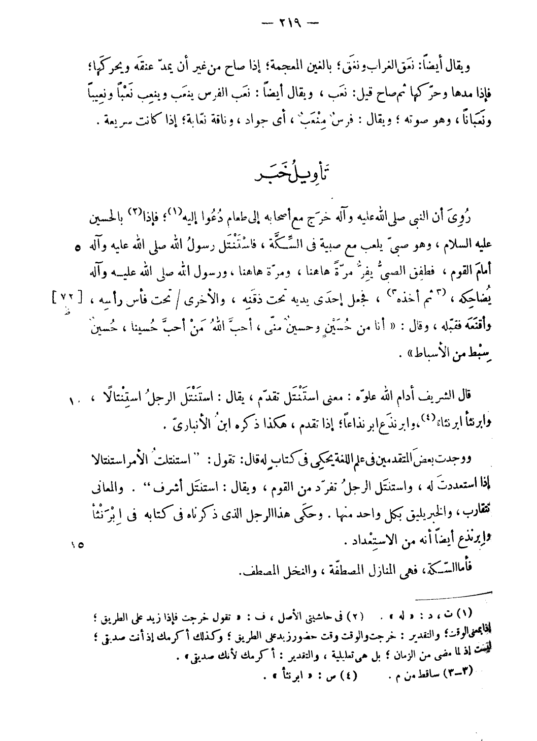 قال الشريف أدام الله علوّه: معنى استنتل تقدّم، يقال: استنتل الرجل استنتالا، وابرنتى ابرنتاء (¬4)، وابرنذع ابرنذاعا؛ إذا تقدم، هكذا ذكره ابن الأنبارىّ.