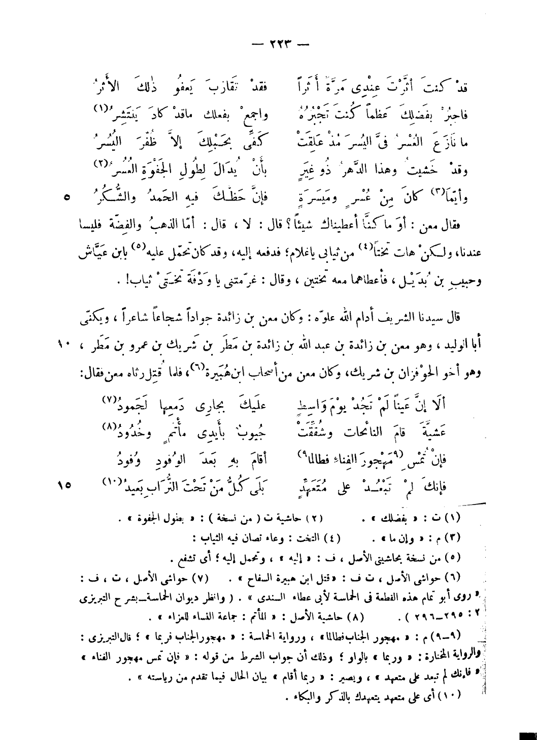 قال سيدنا الشريف أدام الله علوّه: وكان معن بن زائدة جوادا شجاعا شاعرا، ويكنّى أبا الوليد، وهو معن بن زائدة بن عبد الله بن زائدة بن مطر بن شريك بن عمرو بن مطر، وهو أخو الحوفزان بن شريك، وكان معن من أصحاب ابن هبيرة (¬6)، فلما قتل رثاه معن فقال: