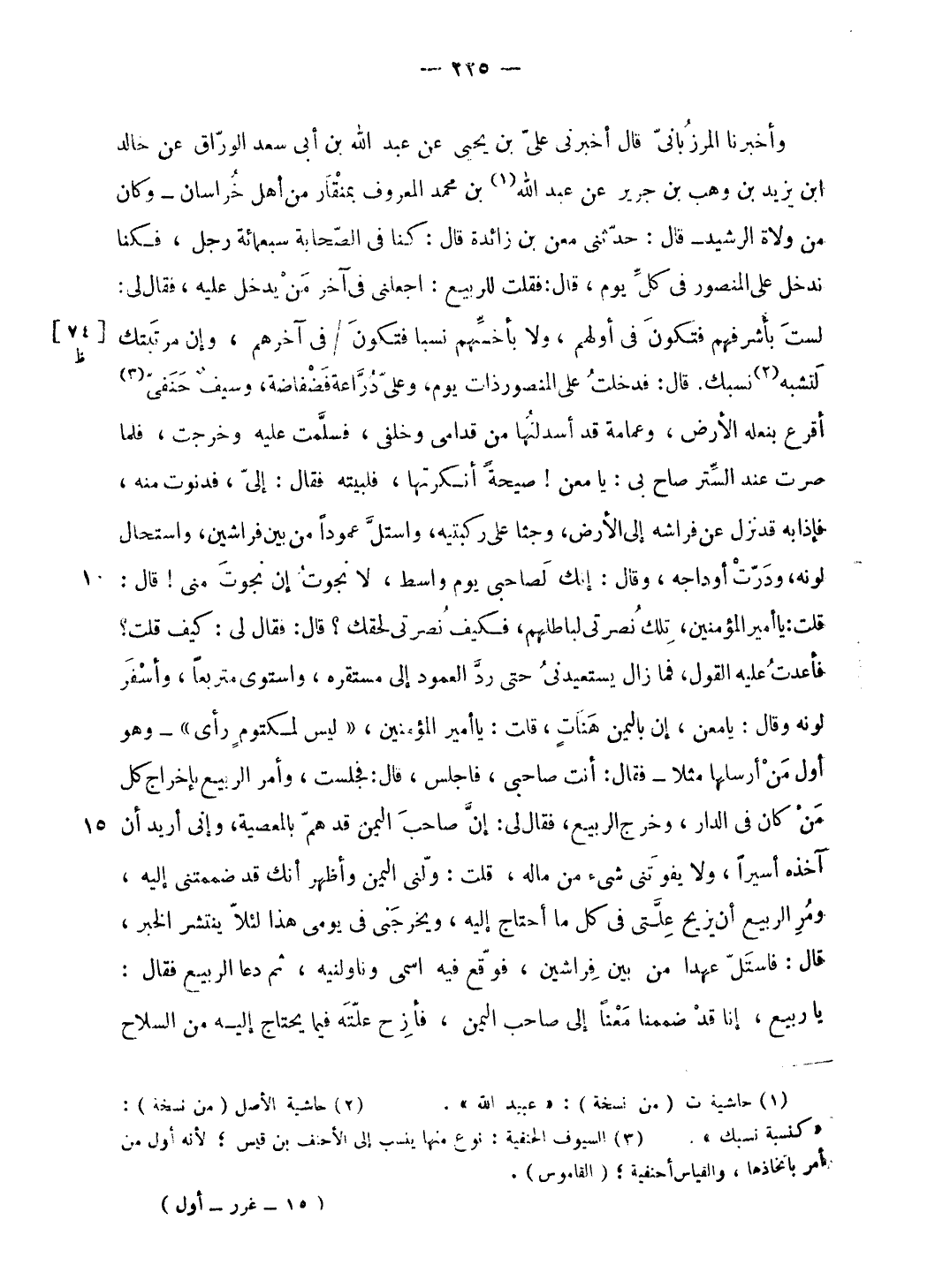 لست بأشرفهم فتكون فى أولهم، ولا بأخسّهم نسبا فتكون/ فى آخرهم، وإن مرتبتك لتشبه (¬2) نسبك. قال: فدخلت على المنصور ذات يوم، وعليّ درّاعة فضفاضة، وسيف حنفىّ (¬3) أقرع بنعله الأرض، وعمامة قد أسدلتها من قدامى وخلفى، فسلّمت عليه وخرجت، فلما صرت عند السّتر صاح بى: يا معن! صيحة أنكرتها، فلبيته فقال: إلى، فدنوت منه، فإذا به قد نزل عن فراشه إلى الأرض، وجثا على ركبتيه، واستلّ عمودا من بين فراشين، واستحال لونه، ودرّت أوداجه، وقال: إنك لصاحبى يوم واسط، لا نجوت إن نجوت منى! قال: