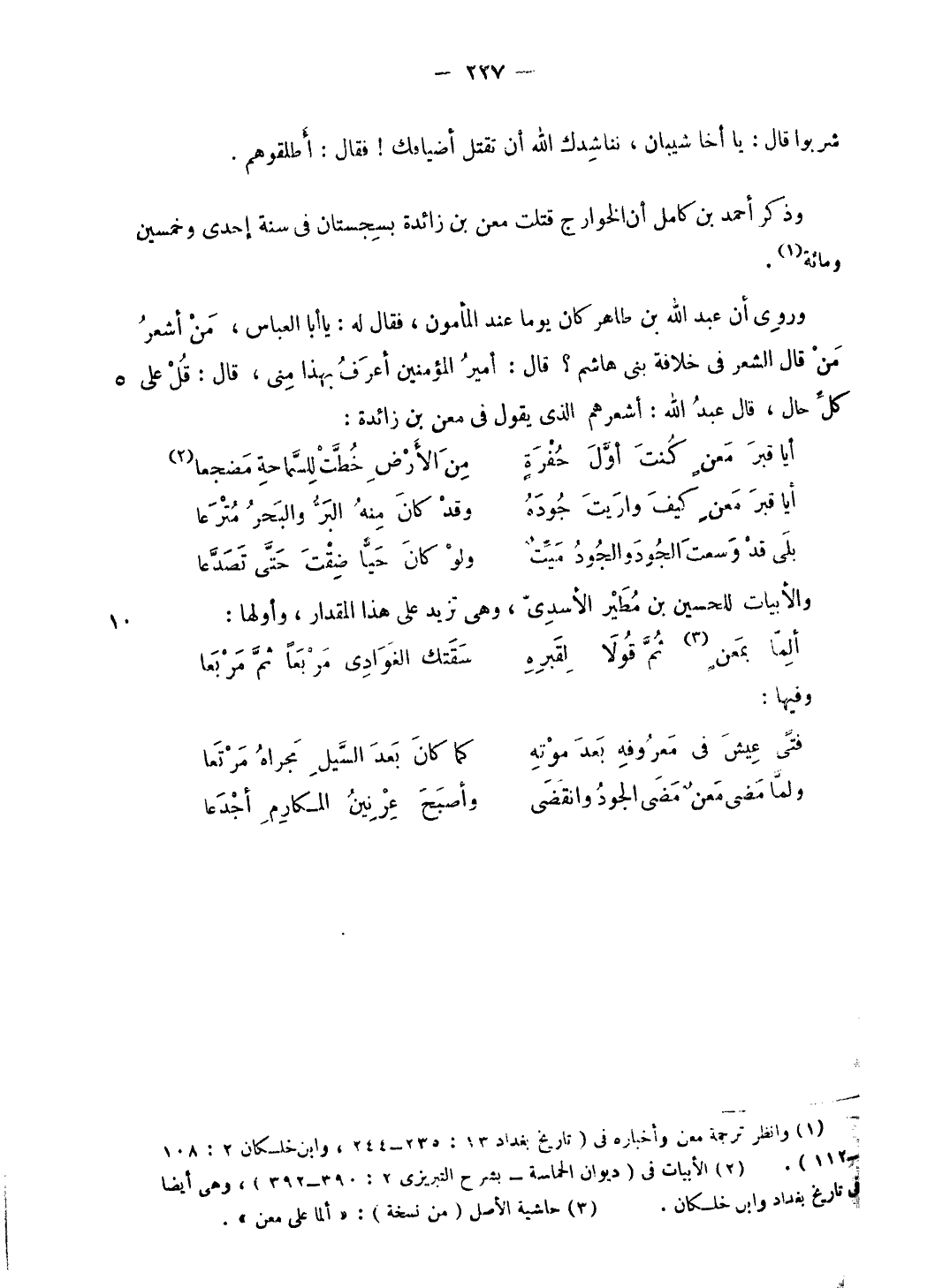 (¬1) وانظر ترجمة معن وأخباره فى (تاريخ بغداد 13: 235 - 244، وابن خلكان 2: 108 - 112).