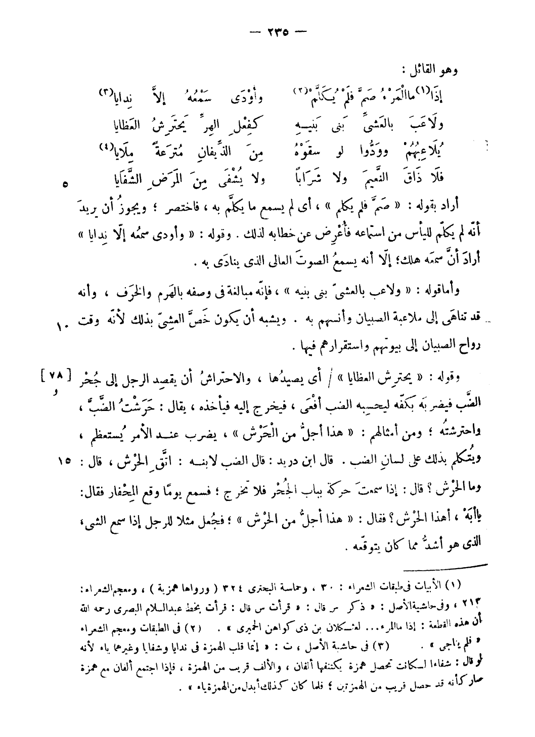 وقوله: «يحترش العظايا» / أى يصيدها، والاحتراش أن يقصد الرجل إلى جحر الضّب فيضربه بكفّه ليحسبه الضب أفعى، فيخرج إليه فيأخذه، يقال: حرشت الضّبّ، واحترشته؛ ومن أمثالهم: «هذا أجلّ من الحرش»، يضرب عند الأمر يستعظم، ويتكلم بذلك على لسان الضب. قال ابن دريد: قال الضب لابنه: اتّق الحرش، قال: