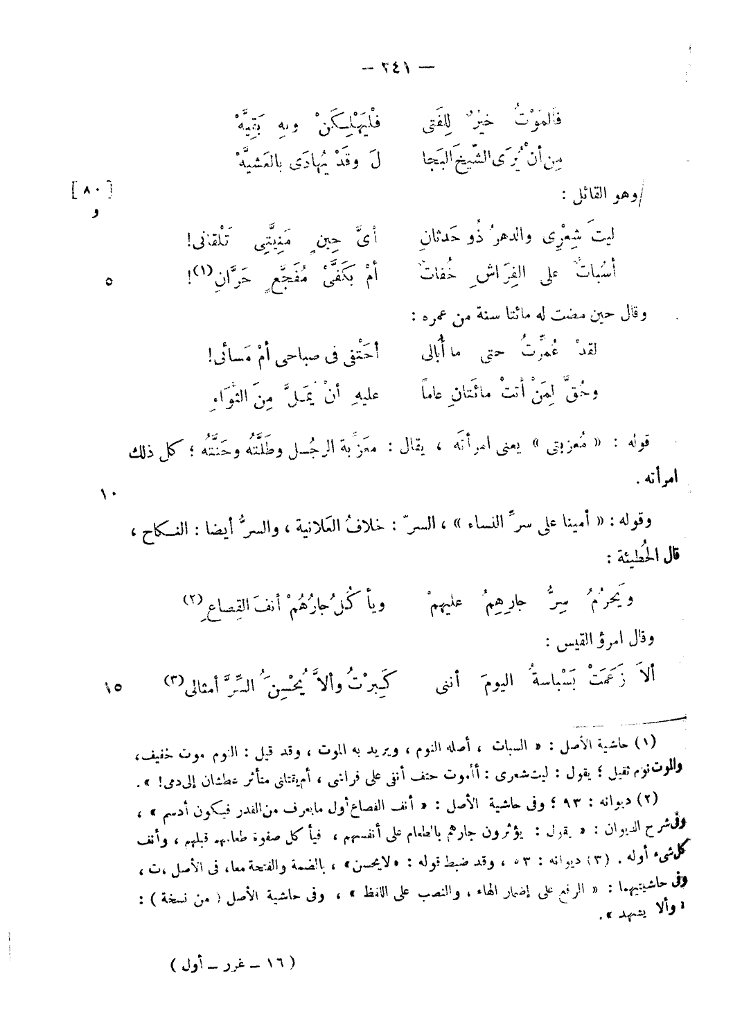 (¬1) حاشية الأصل: «السبات، أصله النوم، ويريد به الموت، وقد قيل: النوم موت خفيف، والموت نوم ثقيل؛ يقول: ليت شعرى: ألموت حتف أنفى على فراشى، أم يقتلنى متأثر عطشان إلى دمى! ».