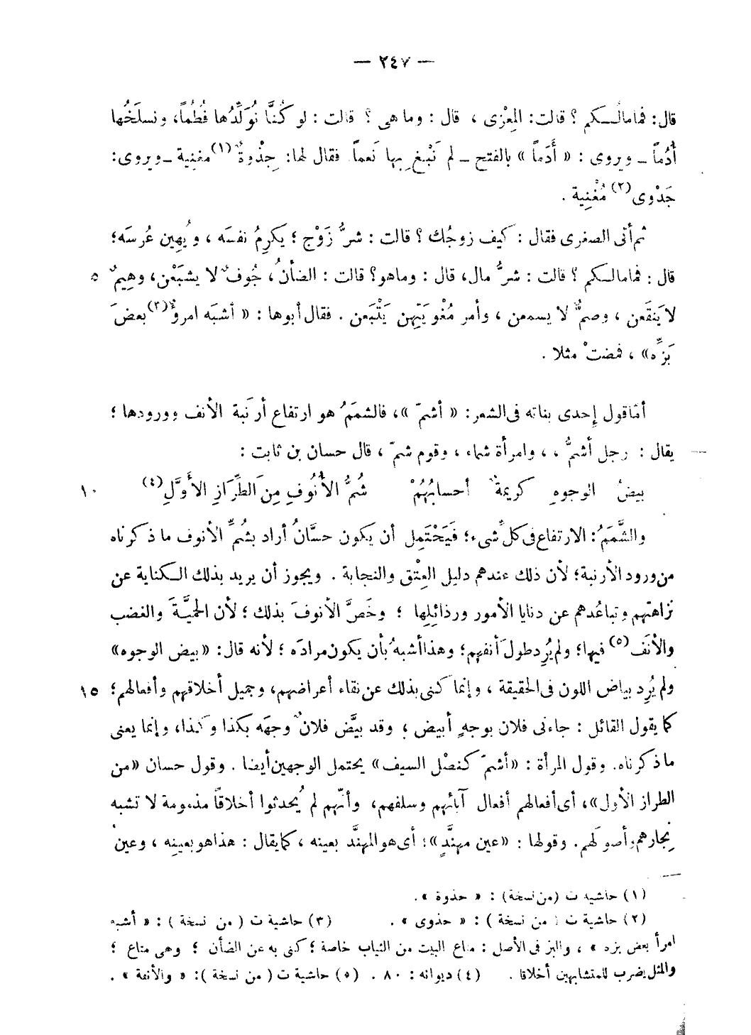 والشّمم: الارتفاع فى كلّ شيء؛ فيحتمل أن يكون حسّان أراد بشمّ الأنوف ما ذكرناه من ورود الأرنبة؛ لأن ذلك عندهم دليل العتق والنجابة. ويجوز أن يريد بذلك الكناية عن نزاهتهم وتباعدهم عن دنايا الأمور ورذائلها؛ وخصّ الأنوف بذلك؛ لأن الحميّة والغضب والأنف (¬5) فيها؛ ولم يرد طول أنفهم؛ وهذا أشبه بأن يكون مراده؛ لأنه قال: «بيض الوجوه» ولم يرد بياض اللون فى الحقيقة، وإنما كنى بذلك عن نقاء أعراضهم، وجميل أخلاقهم وأفعالهم؛ كما يقول القائل: جاءنى فلان بوجه أبيض، وقد بيّض فلان وجهه بكذا وكذا، وإنما يعنى ما ذكرناه. وقول المرأة: «أشمّ كنصل السيف» يحتمل الوجهين أيضا. وقول حسان «من الطراز الأول»، أى أفعالهم أفعال آبائهم وسلفهم، وأنّهم لم يحدثوا أخلاقا مذمومة لا تشبه نجارهم وأصولهم. وقولها: «عين مهنّد»؛ أى هو المهنّد بعينه، كما يقال: هذا هو بعينه، وعين