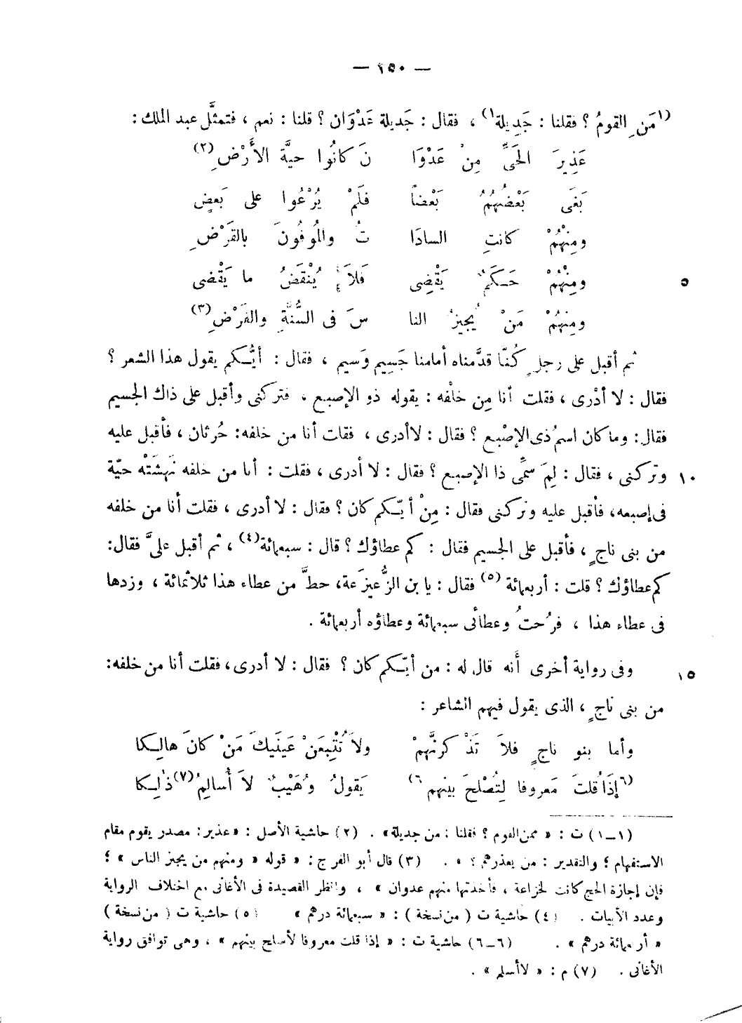 فقال: لا أدرى، فقلت أنا من خلفه: يقوله ذو الإصبع، فتركنى وأقبل على ذاك الجسيم فقال: وما كان اسم ذى الإصبع؟ فقال: لا أدرى، فقلت أنا من خلفه: حرثان، فأقبل عليه وتركنى، فقال: لم سمّى ذا الإصبع؟ فقال: لا أدرى، فقلت: أنا من خلفه نهشته حيّة فى إصبعه، فأقبل عليه وتركنى فقال: من أيّكم كان؟ فقال: لا أدرى، فقلت أنا من خلفه من بنى ناج، فأقبل على الجسيم فقال: كم عطاؤك؟ قال: سبعمائة (¬4)، ثم أقبل عليّ فقال: